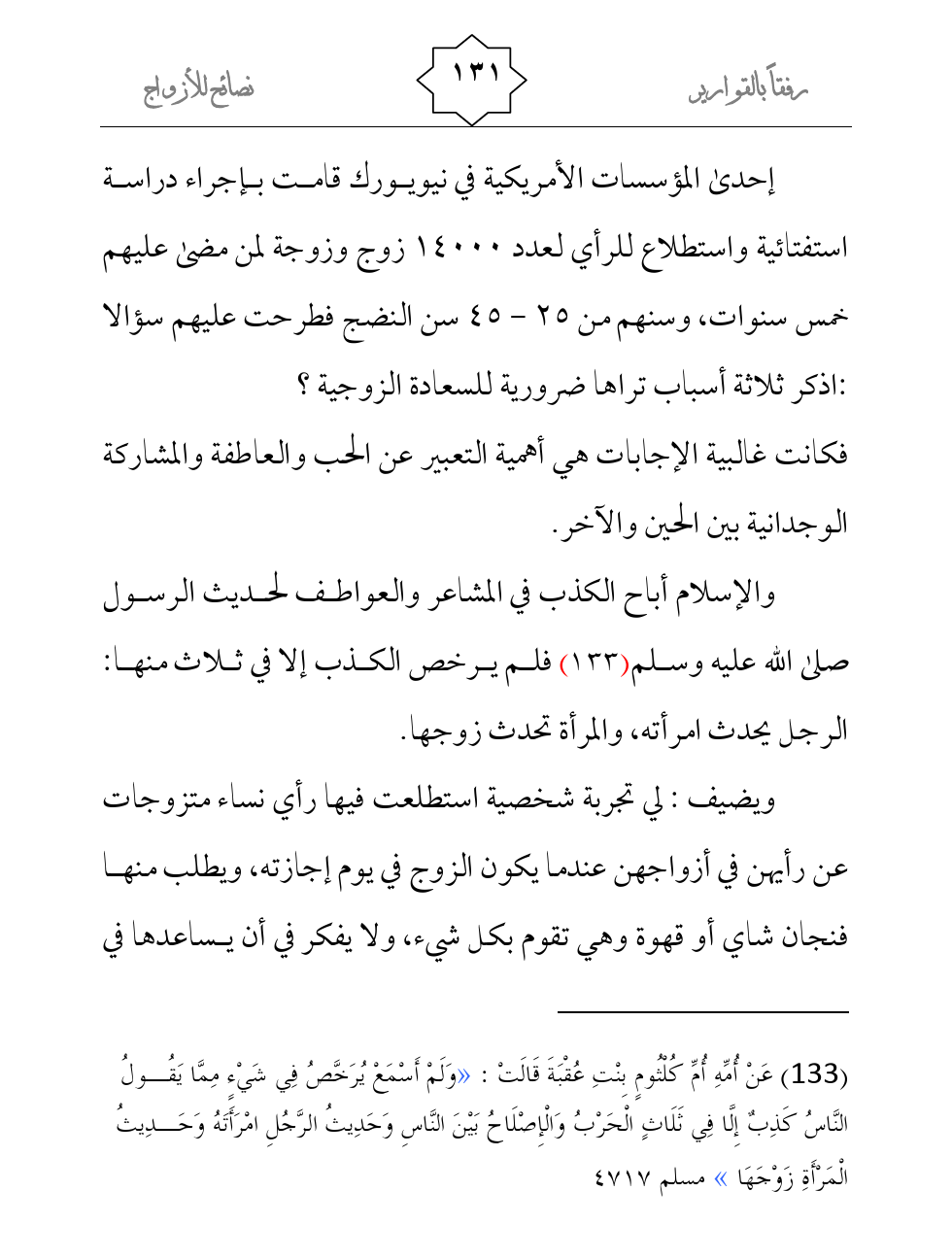 إحدى المؤسسات الأمريكية في نيويورك قامت بإجراء دراسة استفتائية واستطلاع للرأي لعدد 14000 زوج وزوجة لمن مضى عليهم خمس سنوات، وسنهم من 25 - 45 سن النضج فطرحت عليهم سؤالا:اذكر ثلاثة أسباب تراها ضرورية للسعادة الزوجية؟