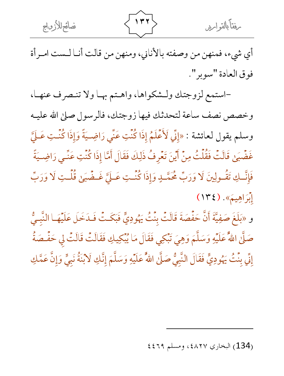 -استمع لزوجتك ولشكواها، واهتم بها ولا تنصرف عنها، وخصص نصف ساعة لتحدثك فيها زوجتك، فالرسول صلى الله عليه وسلم يقول لعائشة: «إِنِّي لَأَعْلَمُ إِذَا كُنْتِ عَنِّي رَاضِيَةً وَإِذَا كُنْتِ عَلَيَّ غَضْبَى قَالَتْ فَقُلْتُ مِنْ أَيْنَ تَعْرِفُ ذَلِكَ فَقَالَ أَمَّا إِذَا كُنْتِ عَنِّي رَاضِيَةً فَإِنَّكِ تَقُولِينَ لَا وَرَبِّ مُحَمَّدٍ وَإِذَا كُنْتِ عَلَيَّ غَضْبَى قُلْتِ لَا وَرَبِّ إِبْرَاهِيمَ» . (¬1)