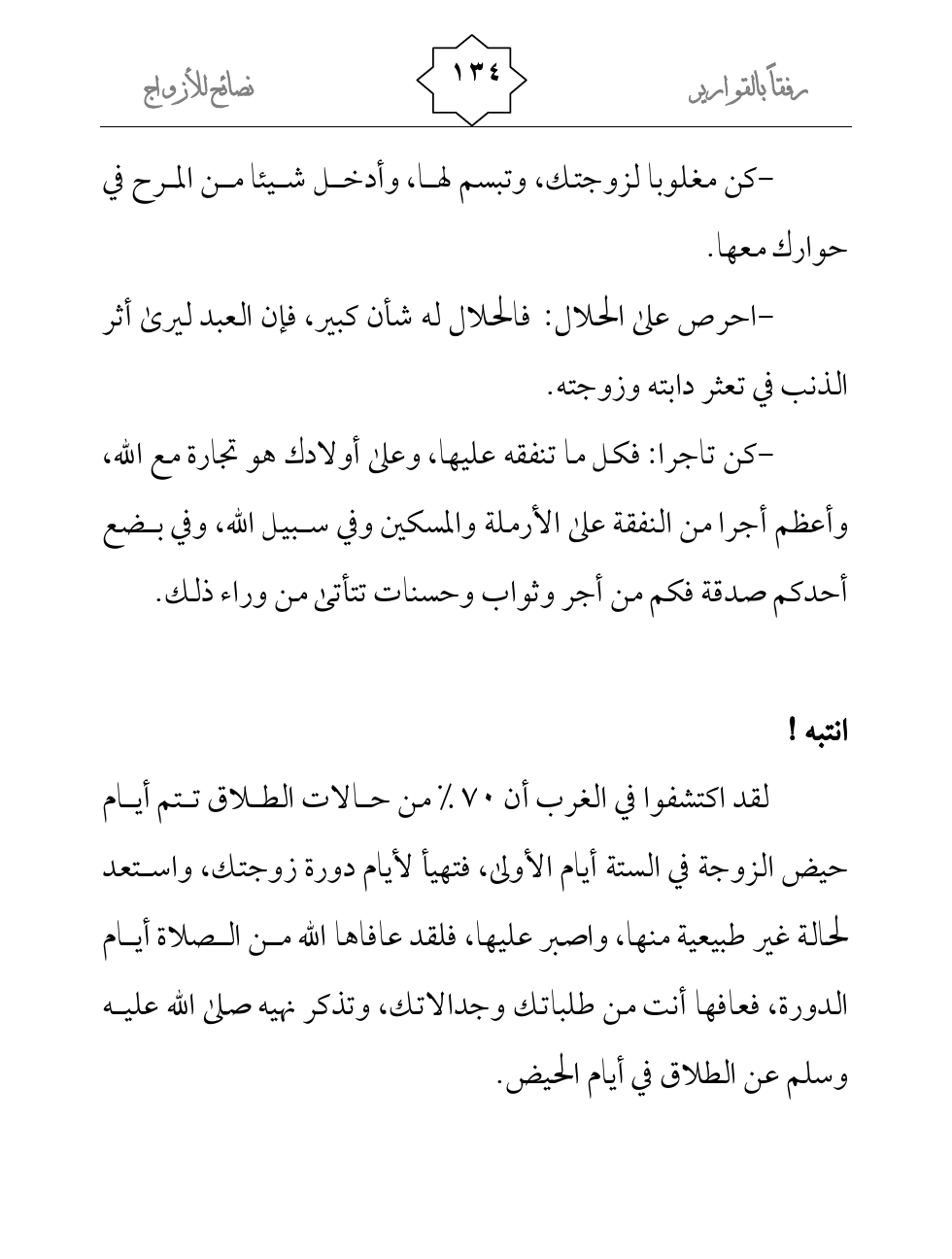 لقد اكتشفوا في الغرب أن 70 % من حالات الطلاق تتم أيام حيض الزوجة في الستة أيام الأولى، فتهيأ لأيام دورة زوجتك، واستعد لحالة غير طبيعية منها، واصبر عليها، فلقد عافاها الله من الصلاة أيام الدورة، فعافها أنت من طلباتك وجدالاتك، وتذكر نهيه صلى الله عليه وسلم عن الطلاق في أيام الحيض.