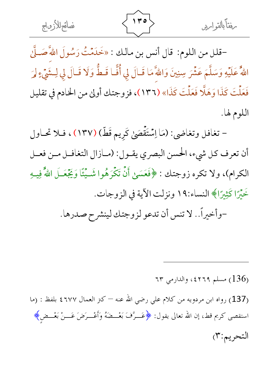 -قلل من اللوم: قال أنس بن مالك: «خَدَمْتُ رَسُولَ اللَّهِ صَلَّى اللَّهُ عَلَيْهِ وَسَلَّمَ عَشْرَ سِنِينَ وَاللَّهِ مَا قَالَ لِي أُفًّا قَطُّ وَلَا قَالَ لِي لِشَيْءٍ لِمَ فَعَلْتَ كَذَا وَهَلَّا فَعَلْتَ كَذَا» (¬1) ، فزوجتك أولى من الخادم في تقليل اللوم لها.