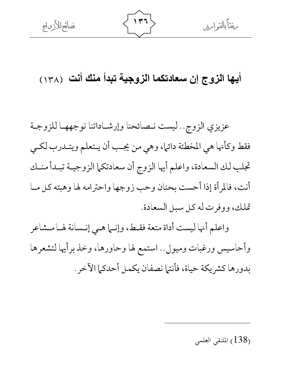 واعلم أنها ليست أداة متعة فقط، وإنما هي إنسانة لها مشاعر وأحاسيس ورغبات وميول.. استمع لها وحاورها، وخذ برأيها لتشعرها بدورها كشريكة حياة، فأنتما نصفان يكمل أحدكما الآخر.