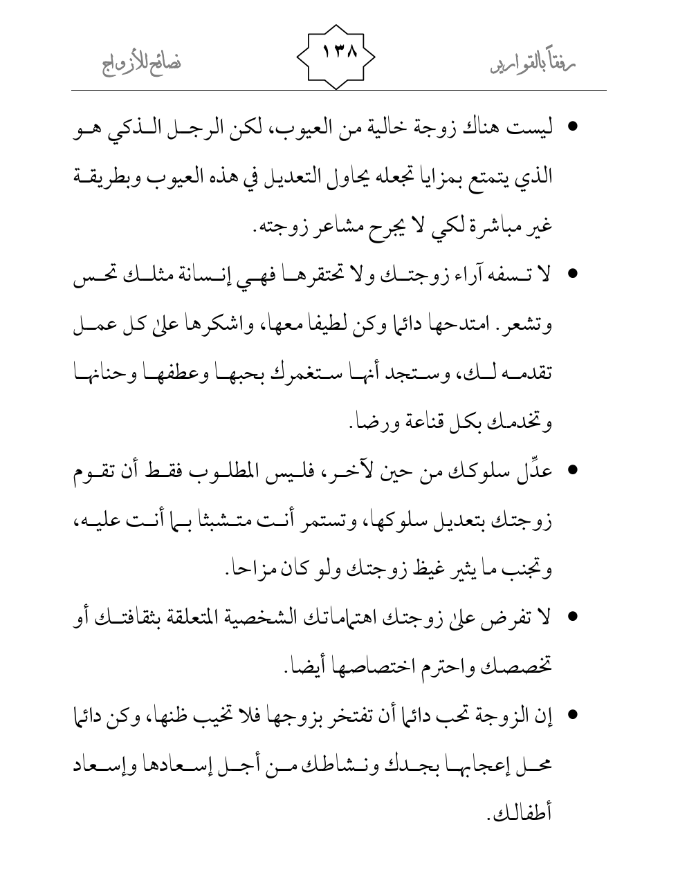 - لا تسفه آراء زوجتك ولا تحتقرها فهي إنسانة مثلك تحس وتشعر. امتدحها دائما وكن لطيفا معها، واشكرها على كل عمل تقدمه لك، وستجد أنها ستغمرك بحبها وعطفها وحنانها وتخدمك بكل قناعة ورضا.