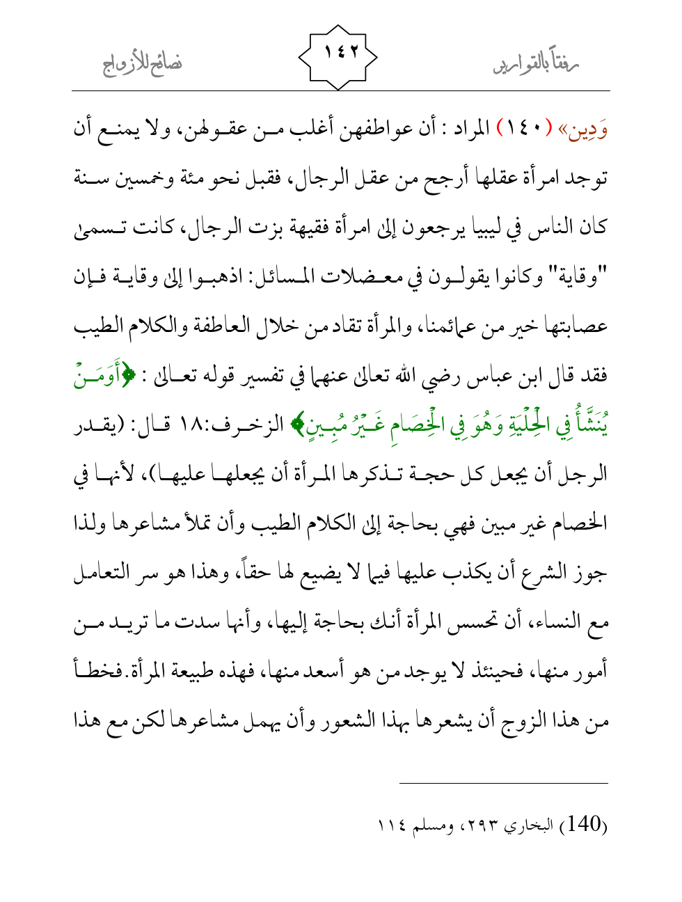وَدِين» (¬1) المراد: أن عواطفهن أغلب من عقولهن، ولا يمنع أن توجد امرأة عقلها أرجح من عقل الرجال، فقبل نحو مئة وخمسين سنة كان الناس في ليبيا يرجعون إلى امرأة فقيهة بزت الرجال، كانت تسمى "وقاية" وكانوا يقولون في معضلات المسائل: اذهبوا إلى وقاية فإن عصابتها خير من عمائمنا، والمرأة تقاد من خلال العاطفة والكلام الطيب فقد قال ابن عباس رضي الله تعالى عنهما في تفسير قوله تعالى: {أَوَمَنْ يُنَشَّأُ فِي الْحِلْيَةِ وَهُوَ فِي الْخِصَامِ غَيْرُ مُبِينٍ} الزخرف:18 قال: (يقدر الرجل أن يجعل كل حجة تذكرها المرأة أن يجعلها عليها) ، لأنها في الخصام غير مبين فهي بحاجة إلى الكلام الطيب وأن تملأ مشاعرها ولذا جوز الشرع أن يكذب عليها فيما لا يضيع لها حقاً، وهذا هو سر التعامل مع النساء، أن تحسس المرأة أنك بحاجة إليها، وأنها سدت ما تريد من أمور منها، فحينئذ لا يوجد من هو أسعد منها، فهذه طبيعة المرأة. فخطأ من هذا الزوج أن يشعرها بهذا الشعور وأن يهمل مشاعرها لكن مع هذا