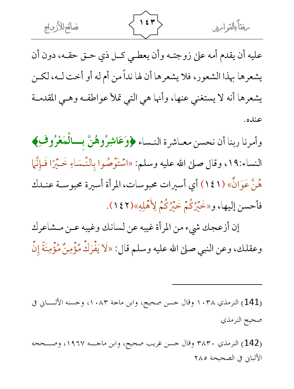 عليه أن يقدم أمه على زوجته وأن يعطي كل ذي حق حقه، دون أن يشعرها بهذا الشعور، فلا يشعرها أن لها نداً من أم له أو أخت له، لكن يشعرها أنه لا يستغني عنها، وأنها هي التي تملأ عواطفه وهي المقدمة عنده.
