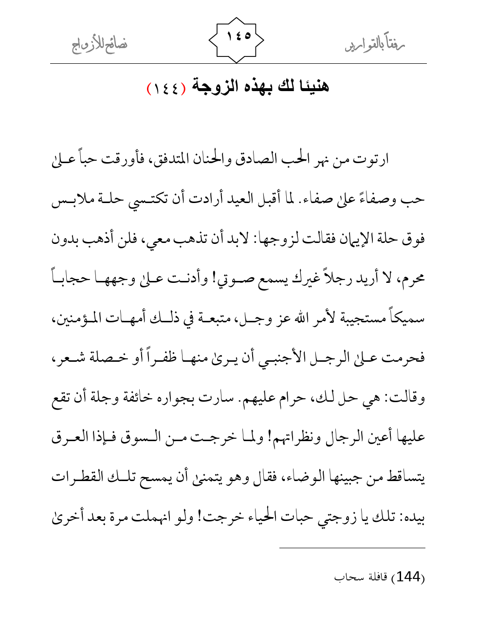ارتوت من نهر الحب الصادق والحنان المتدفق، فأورقت حباً على حب وصفاءً على صفاء. لما أقبل العيد أرادت أن تكتسي حلة ملابس فوق حلة الإيمان فقالت لزوجها: لابد أن تذهب معي، فلن أذهب بدون محرم، لا أريد رجلاً غيرك يسمع صوتي! وأدنت على وجهها حجاباً سميكاً مستجيبة لأمر الله عز وجل، متبعة في ذلك أمهات المؤمنين، فحرمت على الرجل الأجنبي أن يرى منها ظفراً أو خصلة شعر، وقالت: هي حل لك، حرام عليهم. سارت بجواره خائفة وجلة أن تقع عليها أعين الرجال ونظراتهم! ولما خرجت من السوق فإذا العرق يتساقط من جبينها الوضاء، فقال وهو يتمنى أن يمسح تلك القطرات بيده: تلك يا زوجتي حبات الحياء خرجت! ولو انهملت مرة بعد أخرى