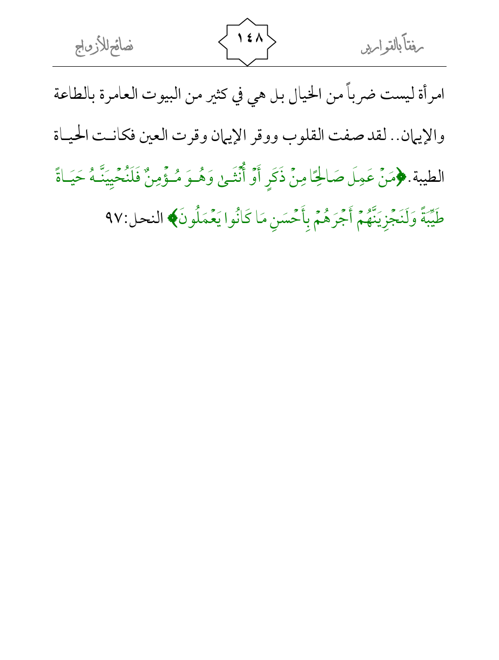 امرأة ليست ضرباً من الخيال بل هي في كثير من البيوت العامرة بالطاعة والإيمان.. لقد صفت القلوب ووقر الإيمان وقرت العين فكانت الحياة الطيبة. {مَنْ عَمِلَ صَالِحًا مِنْ ذَكَرٍ أَوْ أُنْثَى وَهُوَ مُؤْمِنٌ فَلَنُحْيِيَنَّهُ حَيَاةً طَيِّبَةً وَلَنَجْزِيَنَّهُمْ أَجْرَهُمْ بِأَحْسَنِ مَا كَانُوا يَعْمَلُونَ} النحل:97