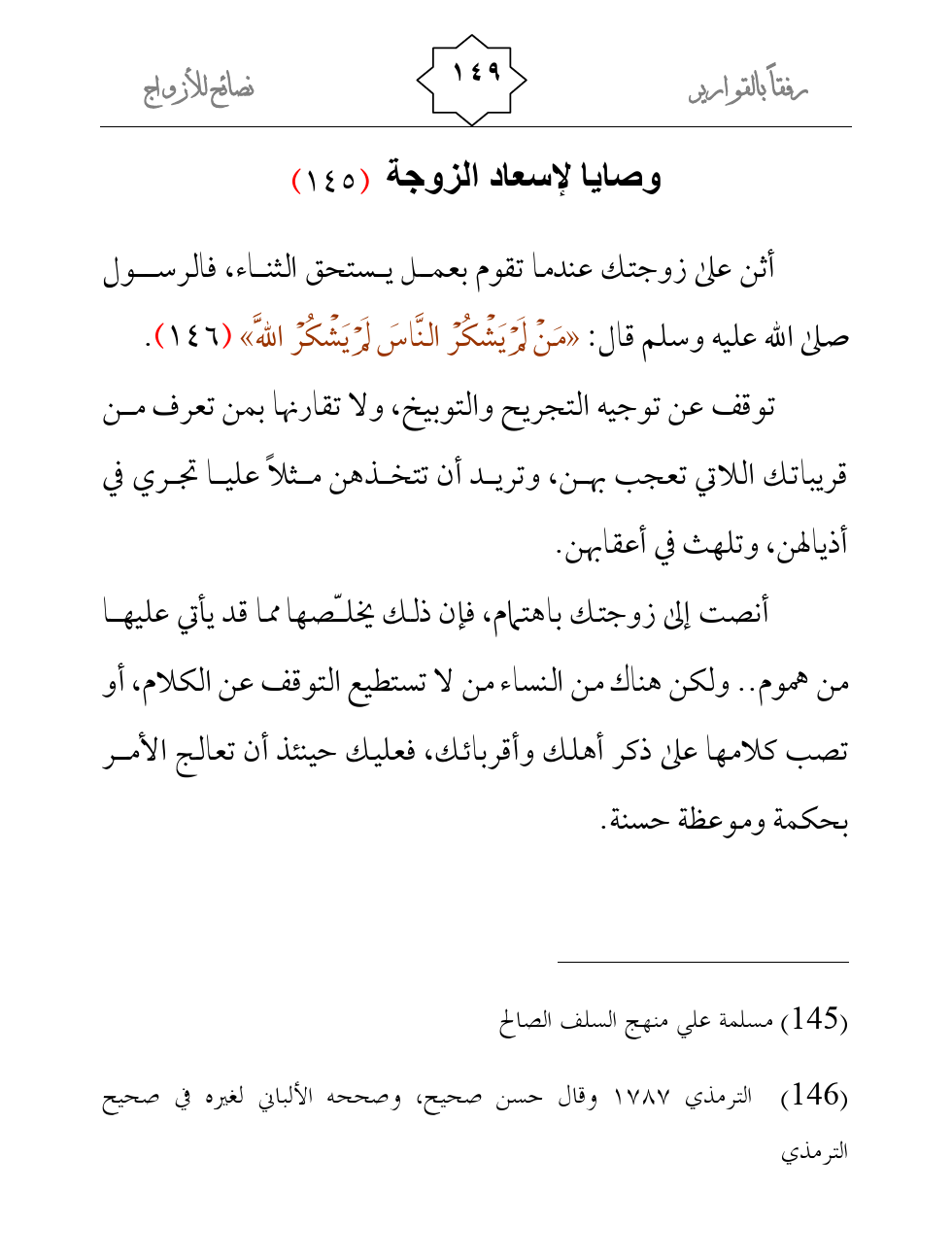 أثن على زوجتك عندما تقوم بعمل يستحق الثناء، فالرسول صلى الله عليه وسلم قال: «مَنْ لَمْ يَشْكُرْ النَّاسَ لَمْ يَشْكُرْ اللَّهَ» (¬2) .