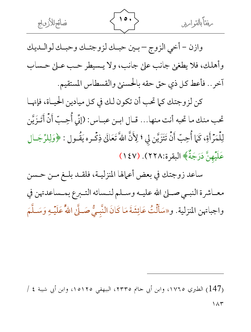 كن لزوجتك كما تحب أن تكون لك في كل ميادين الحياة، فإنها تحب منك ما تحبه أنت منها ... قال ابن عباس: (إنِّي أُحِبّ أَنْ أَتَزَيَّن لِلْمَرْأَةِ، كَمَا أُحِبّ أَنْ تَتَزَيَّن لِي ; لِأَنَّ اللَّه تَعَالَى ذِكْره يَقُول: {وَلِلرِّجَالِ عَلَيْهِنَّ دَرَجَةٌ} البقرة:228) . (¬1)
