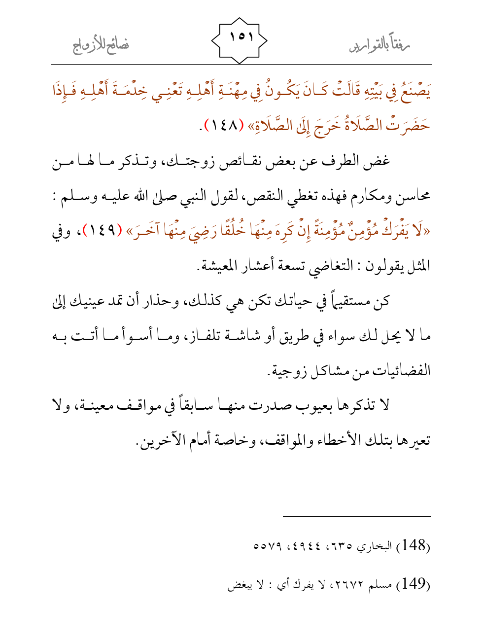 غض الطرف عن بعض نقائص زوجتك، وتذكر ما لها من محاسن ومكارم فهذه تغطي النقص، لقول النبي صلى الله عليه وسلم: «لَا يَفْرَكْ مُؤْمِنٌ مُؤْمِنَةً إِنْ كَرِهَ مِنْهَا خُلُقًا رَضِيَ مِنْهَا آخَرَ» (¬2) ، وفي المثل يقولون: التغاضي تسعة أعشار المعيشة.