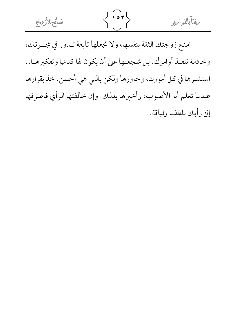 امنح زوجتك الثقة بنفسها، ولا تجعلها تابعة تدور في مجرتك، وخادمة تنفذ أوامرك. بل شجعها على أن يكون لها كيانها وتفكيرها.. استشرها في كل أمورك، وحاورها ولكن بالتي هي أحسن. خذ بقرارها عندما تعلم أنه الأصوب، وأخبرها بذلك. وإن خالفتها الرأي فاصرفها إلى رأيك بلطف ولباقة.
