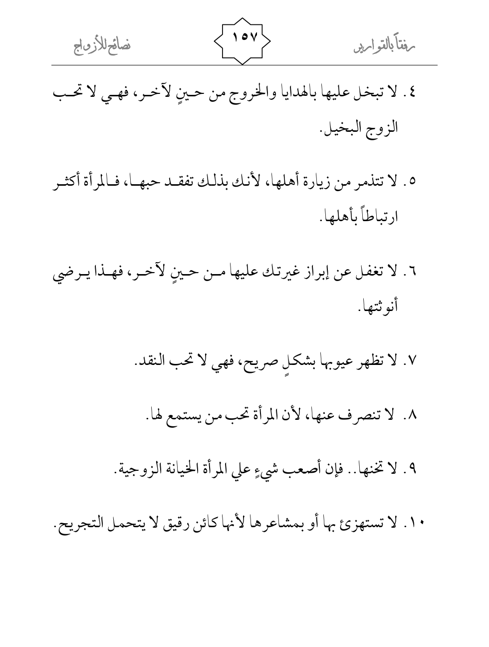 5- لا تتذمر من زيارة أهلها، لأنك بذلك تفقد حبها، فالمرأة أكثر ارتباطاً بأهلها.