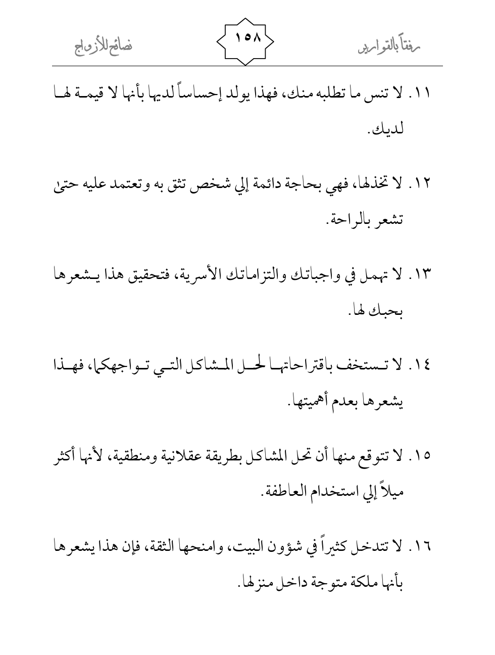 16- لا تتدخل كثيراً في شؤون البيت، وامنحها الثقة، فإن هذا يشعرها بأنها ملكة متوجة داخل منزلها.