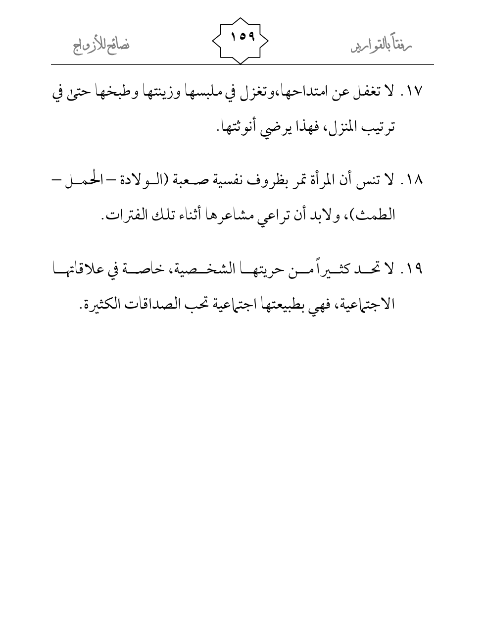 18- لا تنس أن المرأة تمر بظروف نفسية صعبة (الولادة - الحمل - الطمث) ، ولابد أن تراعي مشاعرها أثناء تلك الفترات.