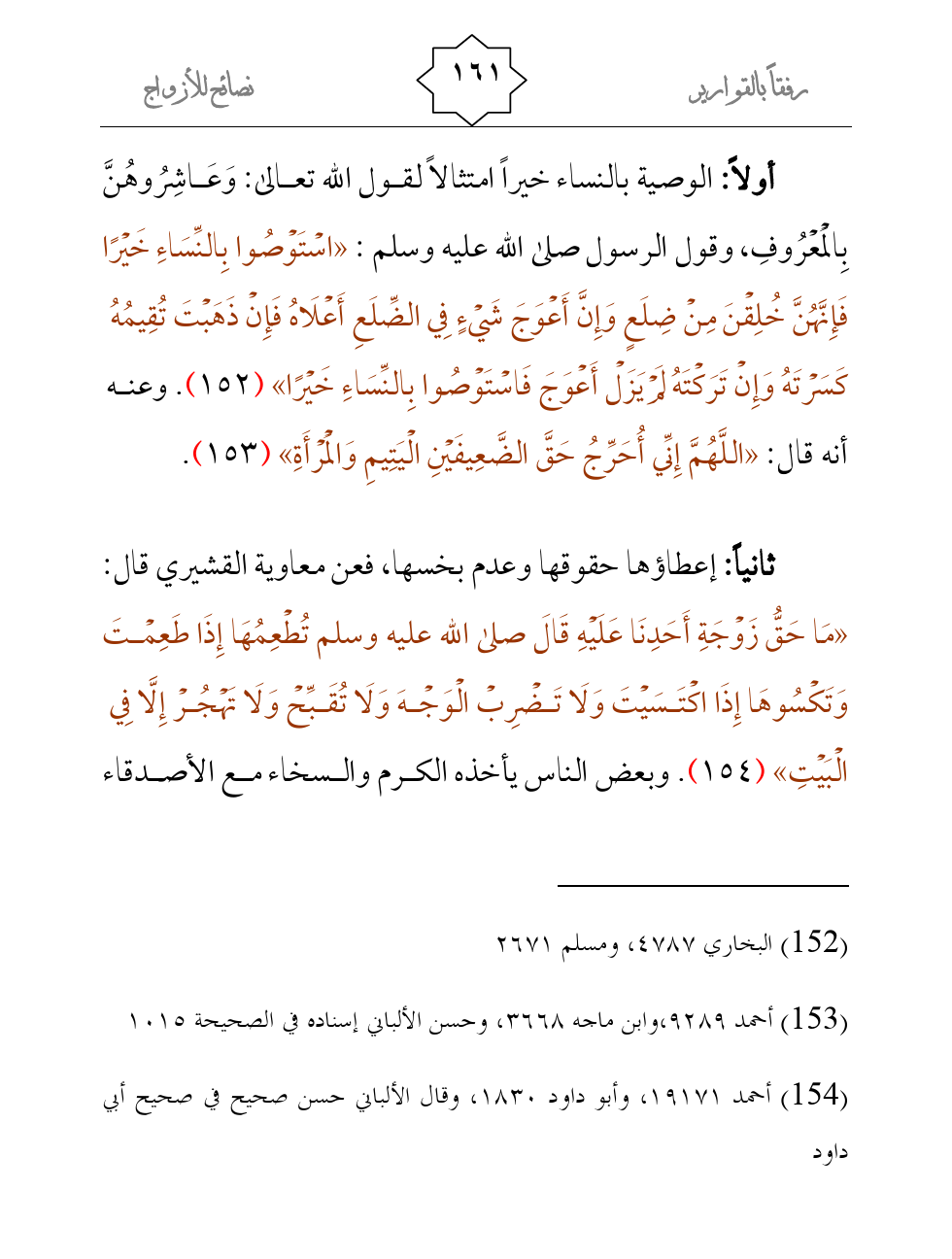 أولاً: الوصية بالنساء خيراً امتثالاً لقول الله تعالى: وَعَاشِرُوهُنَّ بِالْمَعْرُوفِ، وقول الرسول صلى الله عليه وسلم: «اسْتَوْصُوا بِالنِّسَاءِ خَيْرًا فَإِنَّهُنَّ خُلِقْنَ مِنْ ضِلَعٍ وَإِنَّ أَعْوَجَ شَيْءٍ فِي الضِّلَعِ أَعْلَاهُ فَإِنْ ذَهَبْتَ تُقِيمُهُ كَسَرْتَهُ وَإِنْ تَرَكْتَهُ لَمْ يَزَلْ أَعْوَجَ فَاسْتَوْصُوا بِالنِّسَاءِ خَيْرًا» (¬1) . وعنه أنه قال: «اللَّهُمَّ إِنِّي أُحَرِّجُ حَقَّ الضَّعِيفَيْنِ الْيَتِيمِ وَالْمَرْأَةِ» (¬2) .