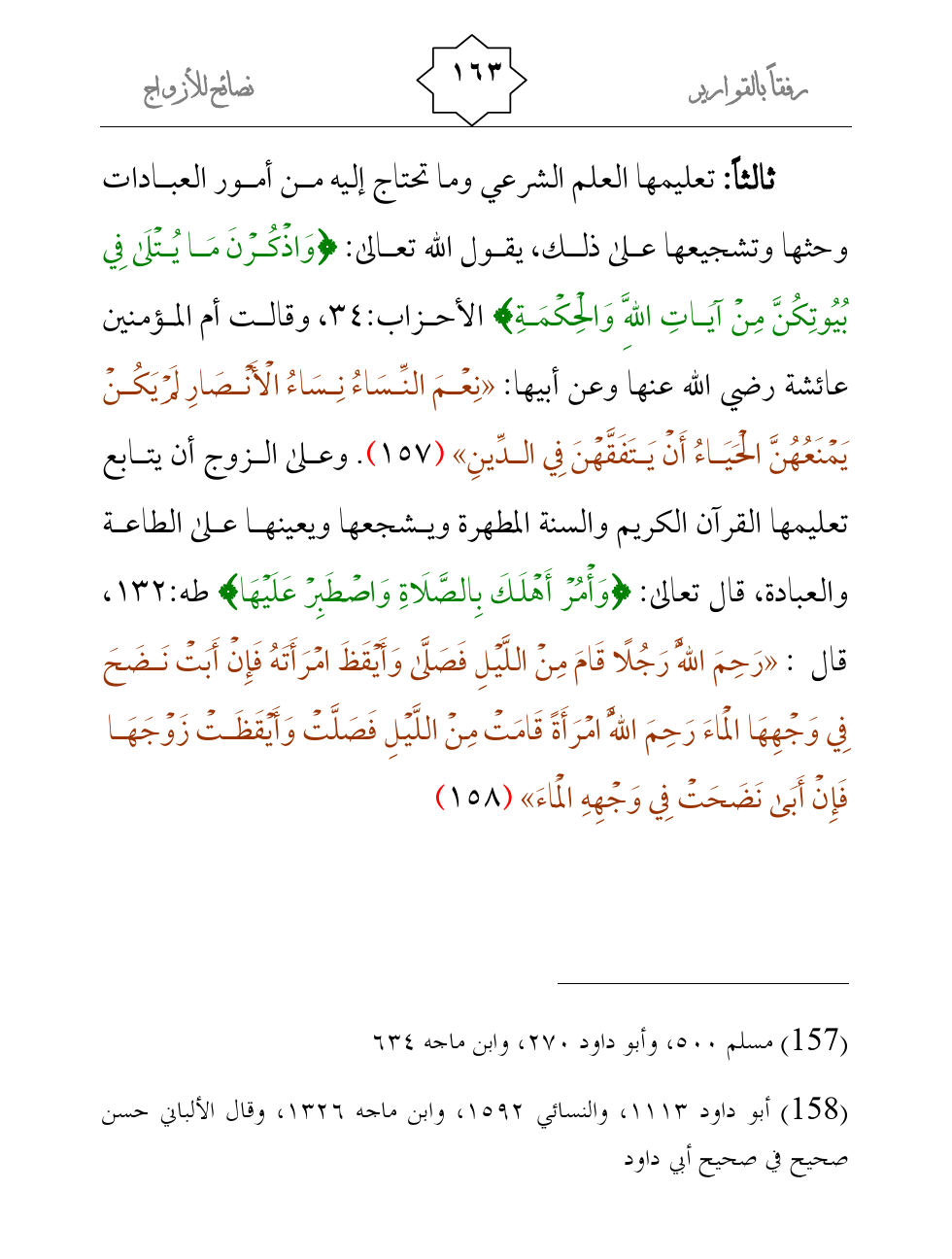ثالثاً: تعليمها العلم الشرعي وما تحتاج إليه من أمور العبادات وحثها وتشجيعها على ذلك، يقول الله تعالى: {وَاذْكُرْنَ مَا يُتْلَى فِي بُيُوتِكُنَّ مِنْ آيَاتِ اللَّهِ وَالْحِكْمَةِ} الأحزاب:34، وقالت أم المؤمنين عائشة رضي الله عنها وعن أبيها: «نِعْمَ النِّسَاءُ نِسَاءُ الْأَنْصَارِ لَمْ يَكُنْ يَمْنَعُهُنَّ الْحَيَاءُ أَنْ يَتَفَقَّهْنَ فِي الدِّينِ» (¬1) . وعلى الزوج أن يتابع تعليمها القرآن الكريم والسنة المطهرة ويشجعها ويعينها على الطاعة والعبادة، قال تعالى: {وَأْمُرْ أَهْلَكَ بِالصَّلَاةِ وَاصْطَبِرْ عَلَيْهَا} طه:132، قال: «رَحِمَ اللَّهُ رَجُلًا قَامَ مِنْ اللَّيْلِ فَصَلَّى وَأَيْقَظَ امْرَأَتَهُ فَإِنْ أَبَتْ نَضَحَ فِي وَجْهِهَا الْمَاءَ رَحِمَ اللَّهُ امْرَأَةً قَامَتْ مِنْ اللَّيْلِ فَصَلَّتْ وَأَيْقَظَتْ زَوْجَهَا فَإِنْ أَبَى نَضَحَتْ فِي وَجْهِهِ الْمَاءَ» (¬2)