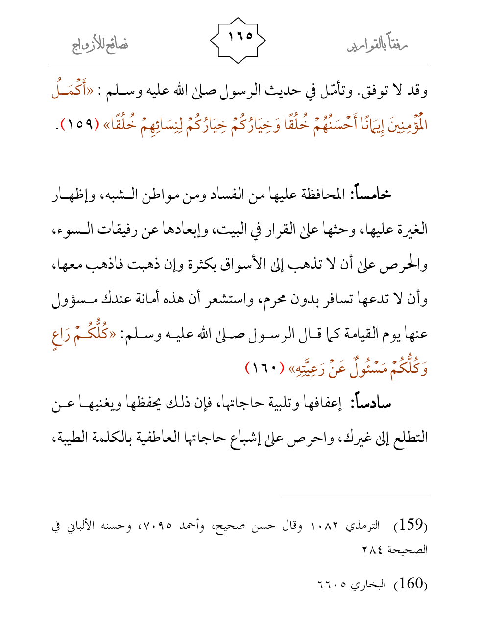 سادساً: إعفافها وتلبية حاجاتها، فإن ذلك يحفظها ويغنيها عن التطلع إلى غيرك، واحرص على إشباع حاجاتها العاطفية بالكلمة الطيبة،