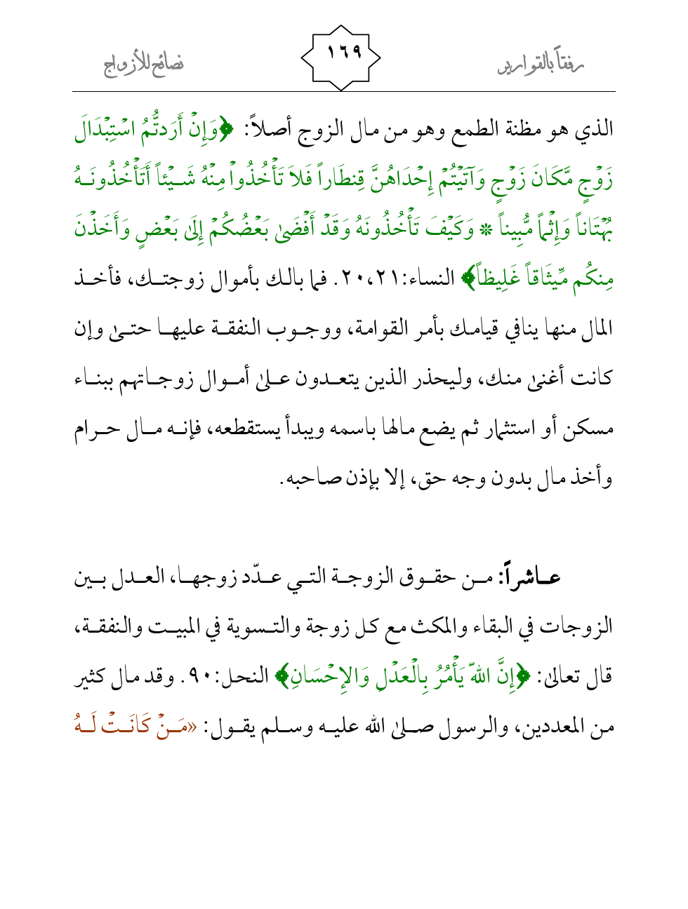 الذي هو مظنة الطمع وهو من مال الزوج أصلاً: {وَإِنْ أَرَدتُّمُ اسْتِبْدَالَ زَوْجٍ مَّكَانَ زَوْجٍ وَآتَيْتُمْ إِحْدَاهُنَّ قِنطَاراً فَلاَ تَأْخُذُواْ مِنْهُ شَيْئاً أَتَأْخُذُونَهُ بُهْتَاناً وَإِثْماً مُّبِيناً * وَكَيْفَ تَأْخُذُونَهُ وَقَدْ أَفْضَى بَعْضُكُمْ إِلَى بَعْضٍ وَأَخَذْنَ مِنكُم مِّيثَاقاً غَلِيظاً} النساء:20،21. فما بالك بأموال زوجتك، فأخذ المال منها ينافي قيامك بأمر القوامة، ووجوب النفقة عليها حتى وإن كانت أغنى منك، وليحذر الذين يتعدون على أموال زوجاتهم ببناء مسكن أو استثمار ثم يضع مالها باسمه ويبدأ يستقطعه، فإنه مال حرام وأخذ مال بدون وجه حق، إلا بإذن صاحبه.