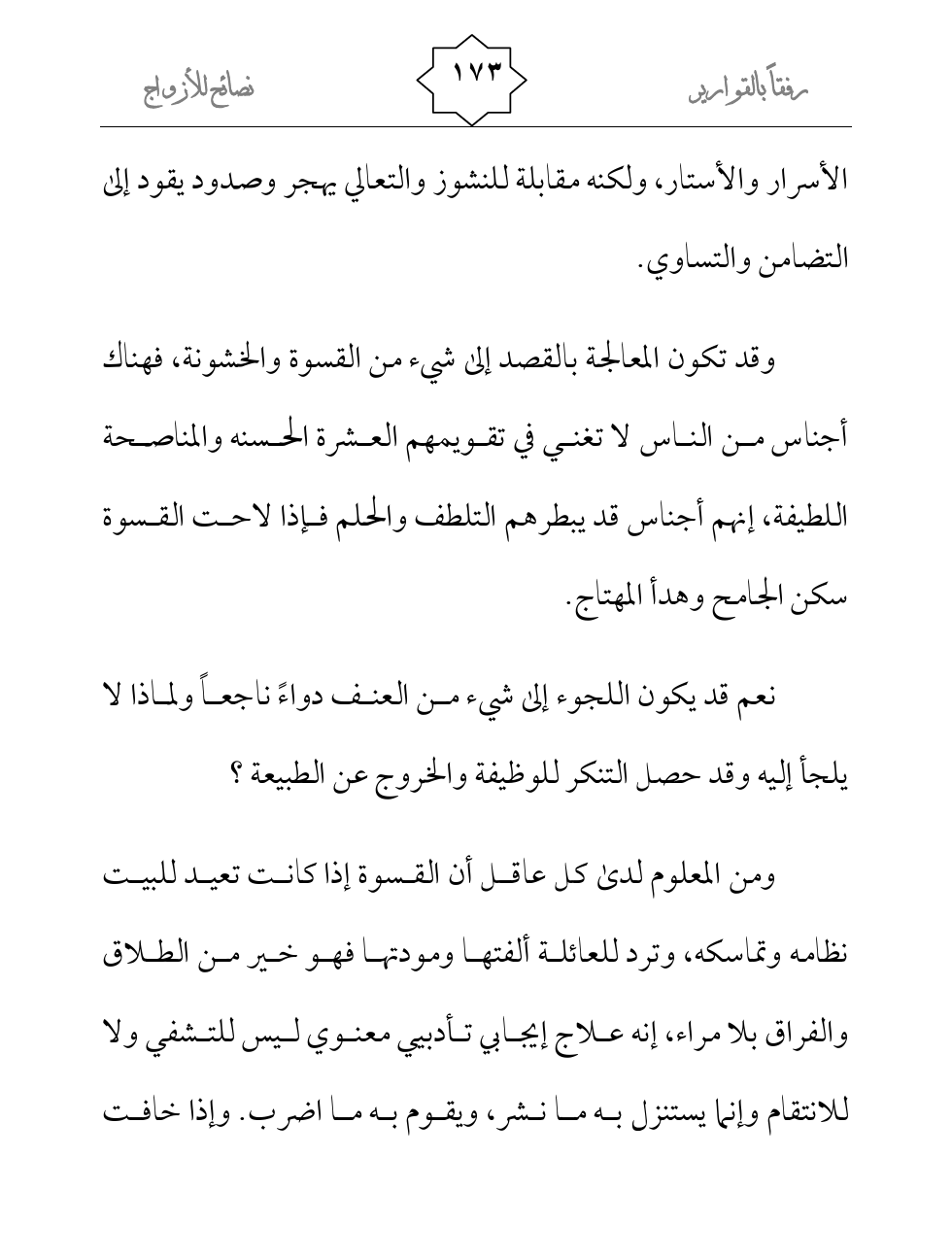 ومن المعلوم لدى كل عاقل أن القسوة إذا كانت تعيد للبيت نظامه وتماسكه، وترد للعائلة ألفتها ومودتها فهو خير من الطلاق والفراق بلا مراء، إنه علاج إيجابي تأدبيي معنوي ليس للتشفي ولا للانتقام وإنما يستنزل به ما نشر، ويقوم به ما اضرب. وإذا خافت