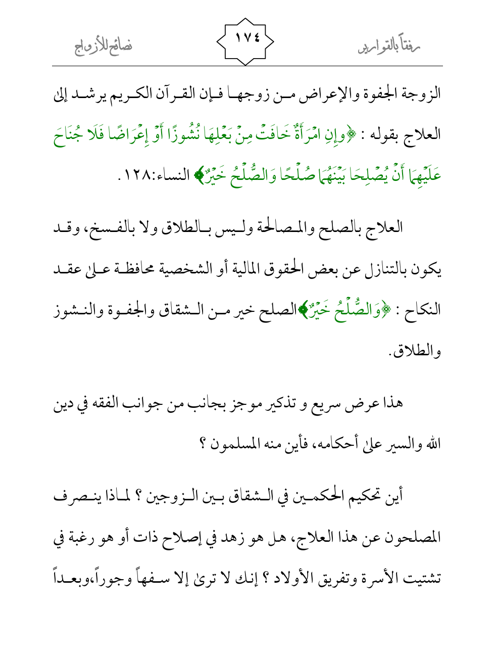 أين تحكيم الحكمين في الشقاق بين الزوجين؟ لماذا ينصرف المصلحون عن هذا العلاج، هل هو زهد في إصلاح ذات أو هو رغبة في تشتيت الأسرة وتفريق الأولاد؟ إنك لا ترى إلا سفهاً وجوراً، وبعداً