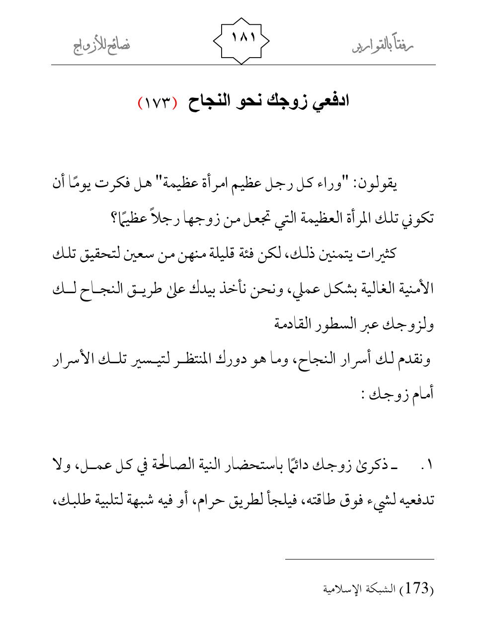 1- ذكرى زوجك دائمًا باستحضار النية الصالحة في كل عمل، ولا تدفعيه لشيء فوق طاقته، فيلجأ لطريق حرام، أو فيه شبهة لتلبية طلبك،