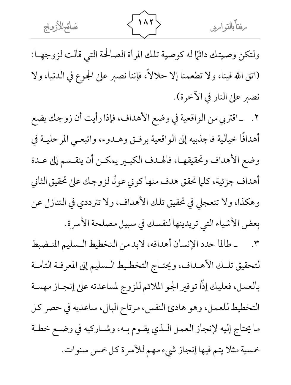 2- اقتربي من الواقعية في وضع الأهداف، فإذا رأيت أن زوجك يضع أهدافًا خيالية فاجذبيه إلى الواقعية برفق وهدوء، واتبعي المرحلية في وضع الأهداف وتحقيقها، فالهدف الكبير يمكن أن ينقسم إلى عدة أهداف جزئية، كلما تحقق هدف منها كوني عونًا لزوجك على تحقيق الثاني وهكذا، ولا تتعجلي في تحقيق تلك الأهداف، ولا تترددي في التنازل عن بعض الأشياء التي تريدينها لنفسك في سبيل مصلحة الأسرة.