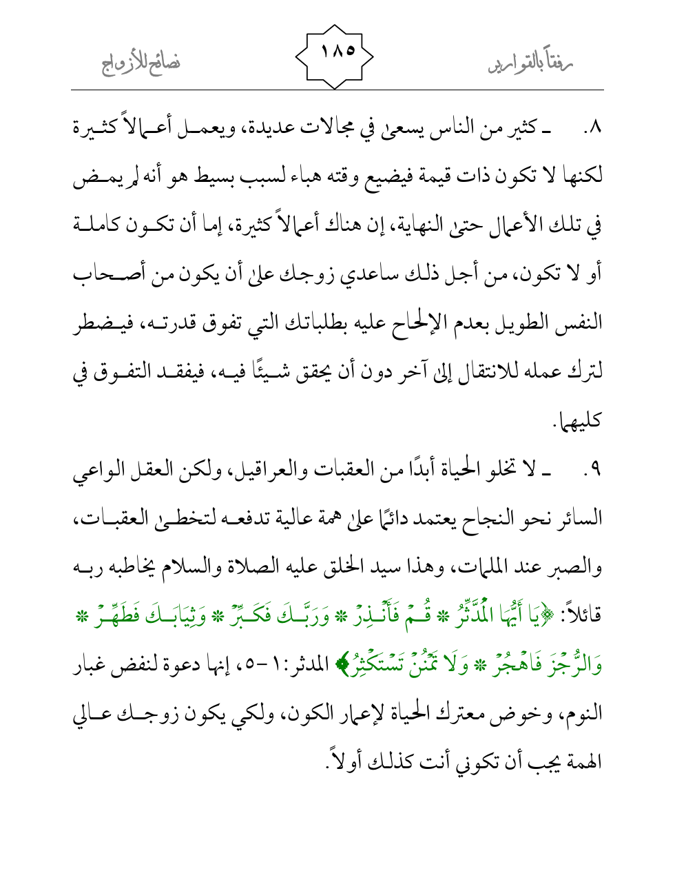 9- لا تخلو الحياة أبدًا من العقبات والعراقيل، ولكن العقل الواعي السائر نحو النجاح يعتمد دائمًا على همة عالية تدفعه لتخطى العقبات، والصبر عند الملمات، وهذا سيد الخلق عليه الصلاة والسلام يخاطبه ربه قائلاً: {يَا أَيُّهَا الْمُدَّثِّرُ * قُمْ فَأَنْذِرْ * وَرَبَّكَ فَكَبِّرْ * وَثِيَابَكَ فَطَهِّرْ * وَالرُّجْزَ فَاهْجُرْ * وَلَا تَمْنُنْ تَسْتَكْثِرُ} المدثر:1-5، إنها دعوة لنفض غبار النوم، وخوض معترك الحياة لإعمار الكون، ولكي يكون زوجك عالي الهمة يجب أن تكوني أنت كذلك أولاً.