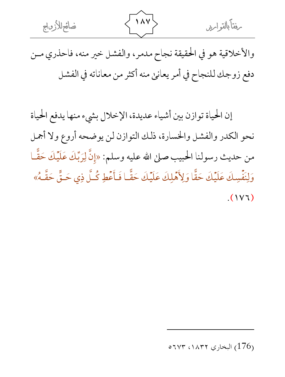 إن الحياة توازن بين أشياء عديدة، الإخلال بشيء منها يدفع الحياة نحو الكدر والفشل والخسارة، ذلك التوازن لن يوضحه أروع ولا أجمل من حديث رسولنا الحبيب صلى الله عليه وسلم: «إِنَّ لِرَبِّكَ عَلَيْكَ حَقًّا وَلِنَفْسِكَ عَلَيْكَ حَقًّا وَلِأَهْلِكَ عَلَيْكَ حَقًّا فَأَعْطِ كُلَّ ذِي حَقٍّ حَقَّهُ» (¬1) .