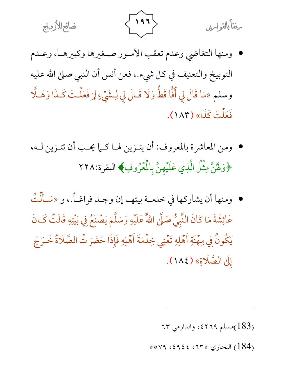 - ومنها أن يشاركها في خدمة بيتها إن وجد فراغاً.، و «سَأَلْتُ عَائِشَةَ مَا كَانَ النَّبِيُّ صَلَّى اللَّهُ عَلَيْهِ وَسَلَّمَ يَصْنَعُ فِي بَيْتِهِ قَالَتْ كَانَ يَكُونُ فِي مِهْنَةِ أَهْلِهِ تَعْنِي خِدْمَةَ أَهْلِهِ فَإِذَا حَضَرَتْ الصَّلَاةُ خَرَجَ إِلَى الصَّلَاةِ» (¬2) .