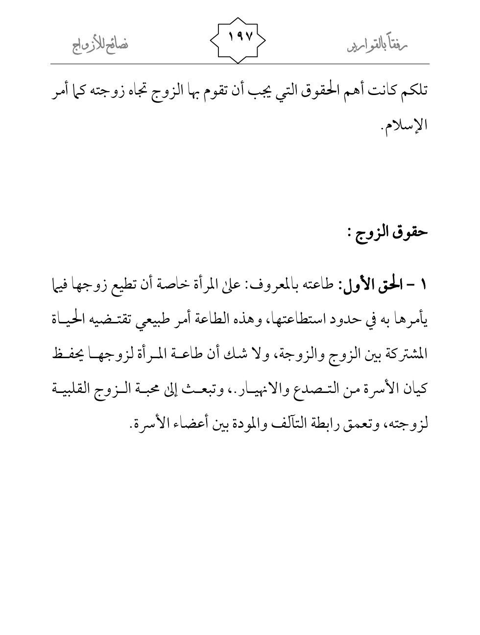1 - الحق الأول: طاعته بالمعروف: على المرأة خاصة أن تطيع زوجها فيما يأمرها به في حدود استطاعتها، وهذه الطاعة أمر طبيعي تقتضيه الحياة المشتركة بين الزوج والزوجة، ولا شك أن طاعة المرأة لزوجها يحفظ كيان الأسرة من التصدع والانهيار.، وتبعث إلى محبة الزوج القلبية لزوجته، وتعمق رابطة التآلف والمودة بين أعضاء الأسرة.