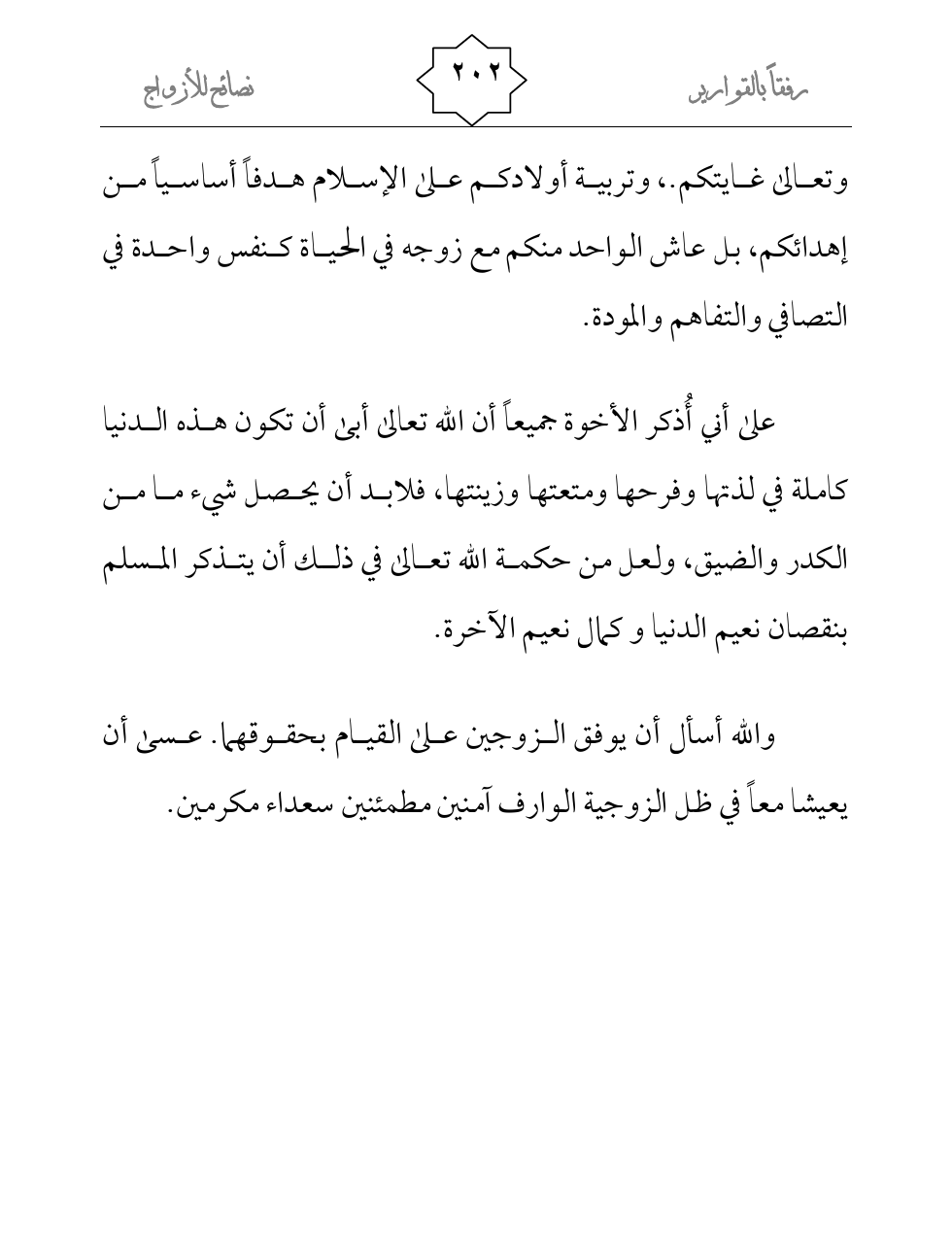 وتعالى غايتكم.، وتربية أولادكم على الإسلام هدفاً أساسياً من إهدائكم، بل عاش الواحد منكم مع زوجه في الحياة كنفس واحدة في التصافي والتفاهم والمودة.