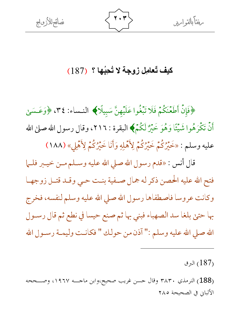 {فَإِنْ أَطَعْنَكُمْ فَلَا تَبْغُوا عَلَيْهِنَّ سَبِيلًا} النساء: 34، {وَعَسَى أَنْ تَكْرَهُوا شَيْئًا وَهُوَ خَيْرٌ لَكُمْ} البقرة: 216، وقال رسول الله صلى الله عليه وسلم: «خَيْرُكُمْ خَيْرُكُمْ لِأَهْلِهِ وَأَنَا خَيْرُكُمْ لِأَهْلِي» (¬2)