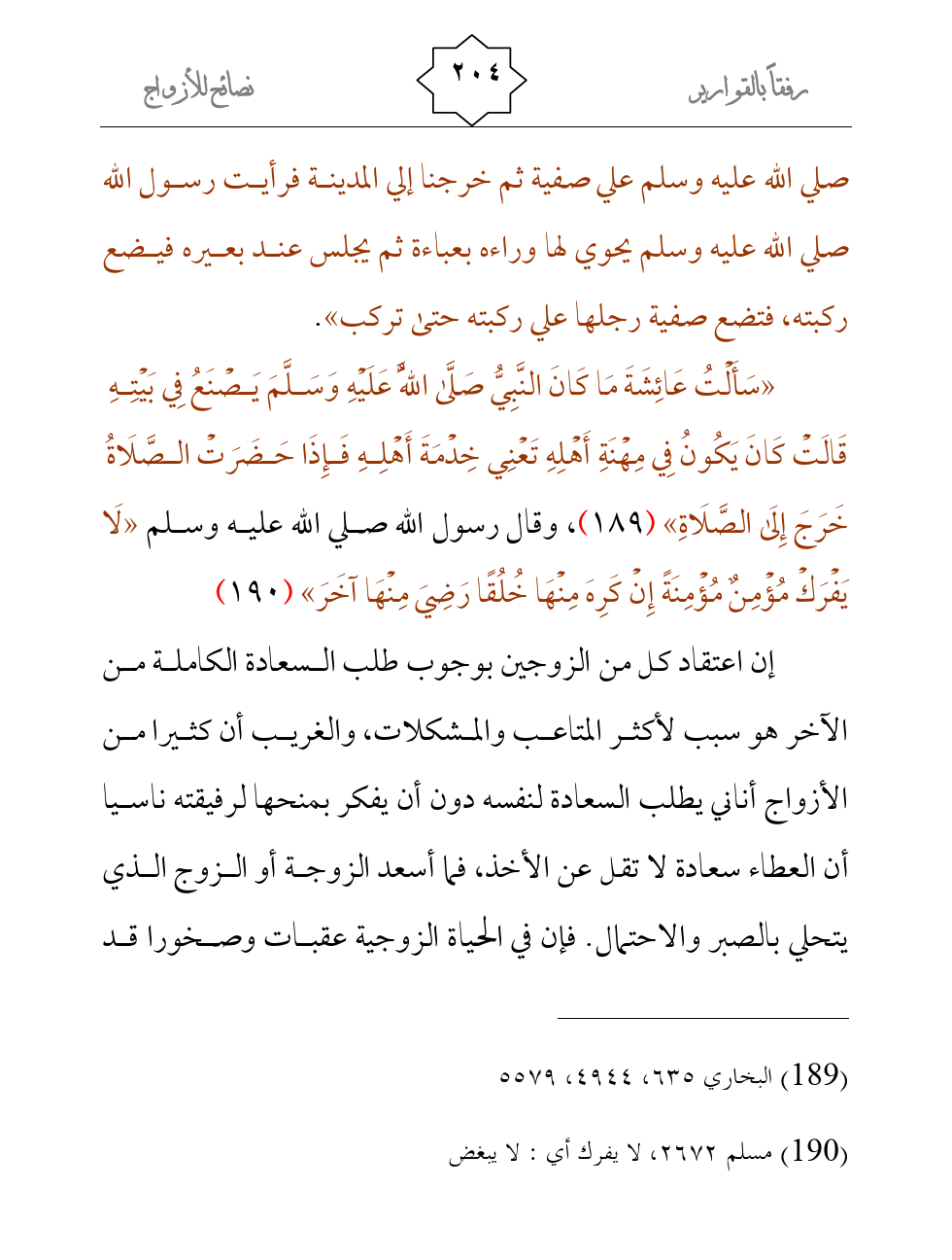 «سَأَلْتُ عَائِشَةَ مَا كَانَ النَّبِيُّ صَلَّى اللَّهُ عَلَيْهِ وَسَلَّمَ يَصْنَعُ فِي بَيْتِهِ قَالَتْ كَانَ يَكُونُ فِي مِهْنَةِ أَهْلِهِ تَعْنِي خِدْمَةَ أَهْلِهِ فَإِذَا حَضَرَتْ الصَّلَاةُ خَرَجَ إِلَى الصَّلَاةِ» (¬1) ، وقال رسول الله صلي الله عليه وسلم «لَا يَفْرَكْ مُؤْمِنٌ مُؤْمِنَةً إِنْ كَرِهَ مِنْهَا خُلُقًا رَضِيَ مِنْهَا آخَرَ» (¬2)