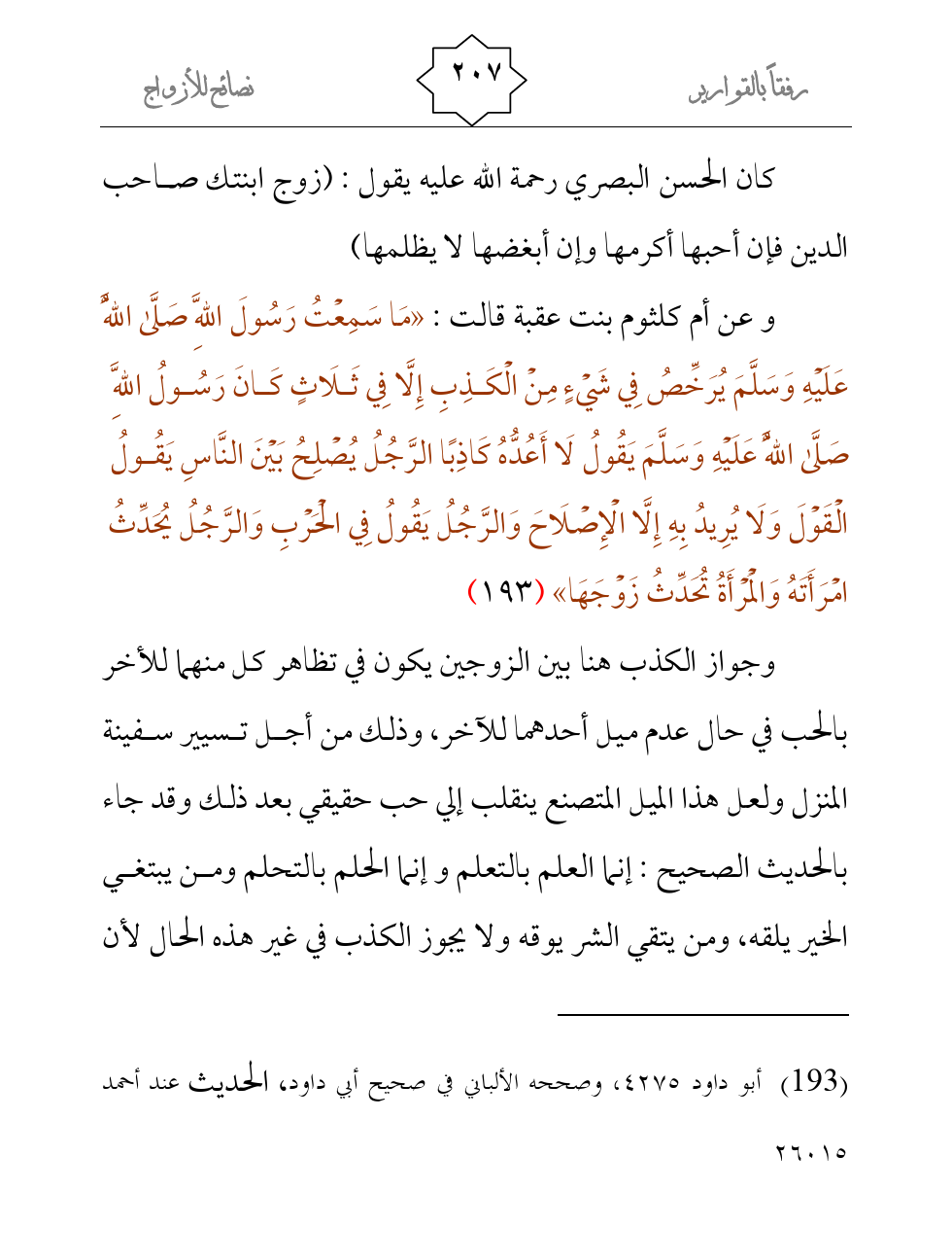 وعن أم كلثوم بنت عقبة قالت: «مَا سَمِعْتُ رَسُولَ اللَّهِ صَلَّى اللَّهُ عَلَيْهِ وَسَلَّمَ يُرَخِّصُ فِي شَيْءٍ مِنْ الْكَذِبِ إِلَّا فِي ثَلَاثٍ كَانَ رَسُولُ اللَّهِ صَلَّى اللَّهُ عَلَيْهِ وَسَلَّمَ يَقُولُ لَا أَعُدُّهُ كَاذِبًا الرَّجُلُ يُصْلِحُ بَيْنَ النَّاسِ يَقُولُ الْقَوْلَ وَلَا يُرِيدُ بِهِ إِلَّا الْإِصْلَاحَ وَالرَّجُلُ يَقُولُ فِي الْحَرْبِ وَالرَّجُلُ يُحَدِّثُ امْرَأَتَهُ وَالْمَرْأَةُ تُحَدِّثُ زَوْجَهَا» (¬1)