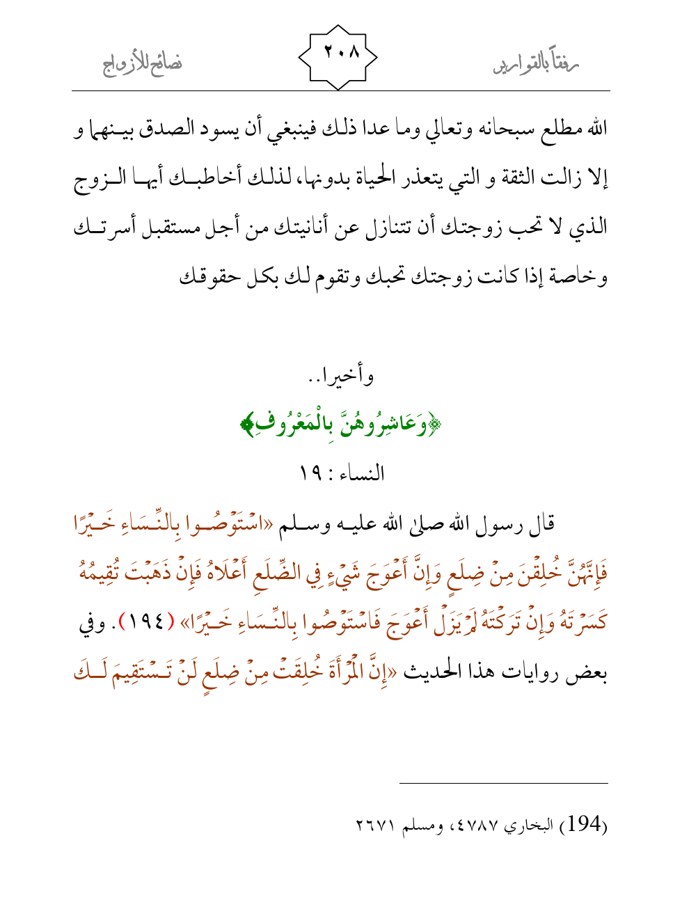 قال رسول الله صلى الله عليه وسلم «اسْتَوْصُوا بِالنِّسَاءِ خَيْرًا فَإِنَّهُنَّ خُلِقْنَ مِنْ ضِلَعٍ وَإِنَّ أَعْوَجَ شَيْءٍ فِي الضِّلَعِ أَعْلَاهُ فَإِنْ ذَهَبْتَ تُقِيمُهُ كَسَرْتَهُ وَإِنْ تَرَكْتَهُ لَمْ يَزَلْ أَعْوَجَ فَاسْتَوْصُوا بِالنِّسَاءِ خَيْرًا» (¬1) . وفي بعض روايات هذا الحديث «إِنَّ الْمَرْأَةَ خُلِقَتْ مِنْ ضِلَعٍ لَنْ تَسْتَقِيمَ لَكَ