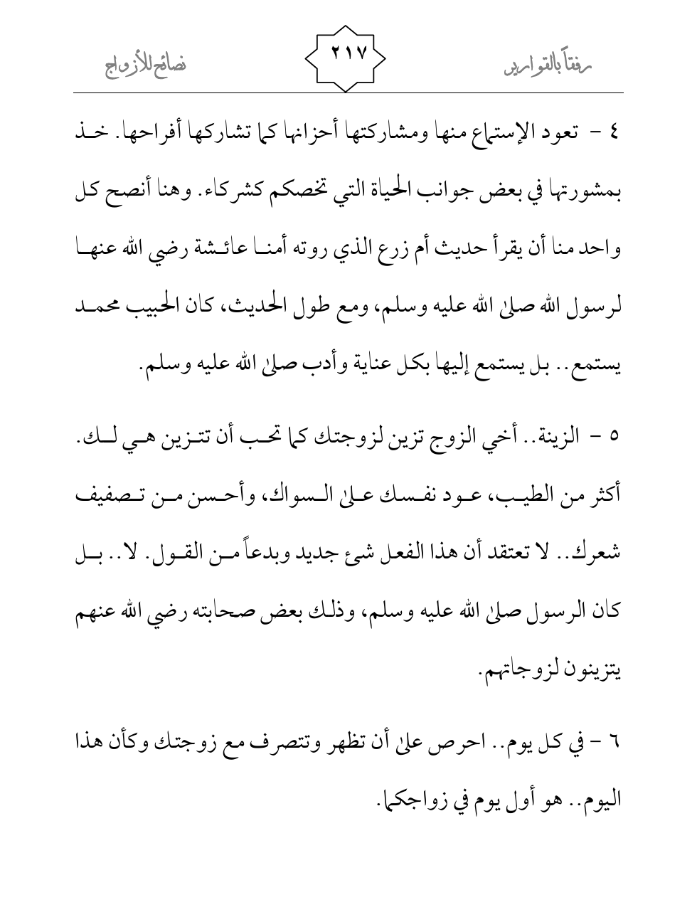 5 - الزينة.. أخي الزوج تزين لزوجتك كما تحب أن تتزين هي لك. أكثر من الطيب، عود نفسك على السواك، وأحسن من تصفيف شعرك.. لا تعتقد أن هذا الفعل شئ جديد وبدعاً من القول. لا.. بل كان الرسول صلى الله عليه وسلم، وذلك بعض صحابته رضي الله عنهم يتزينون لزوجاتهم.