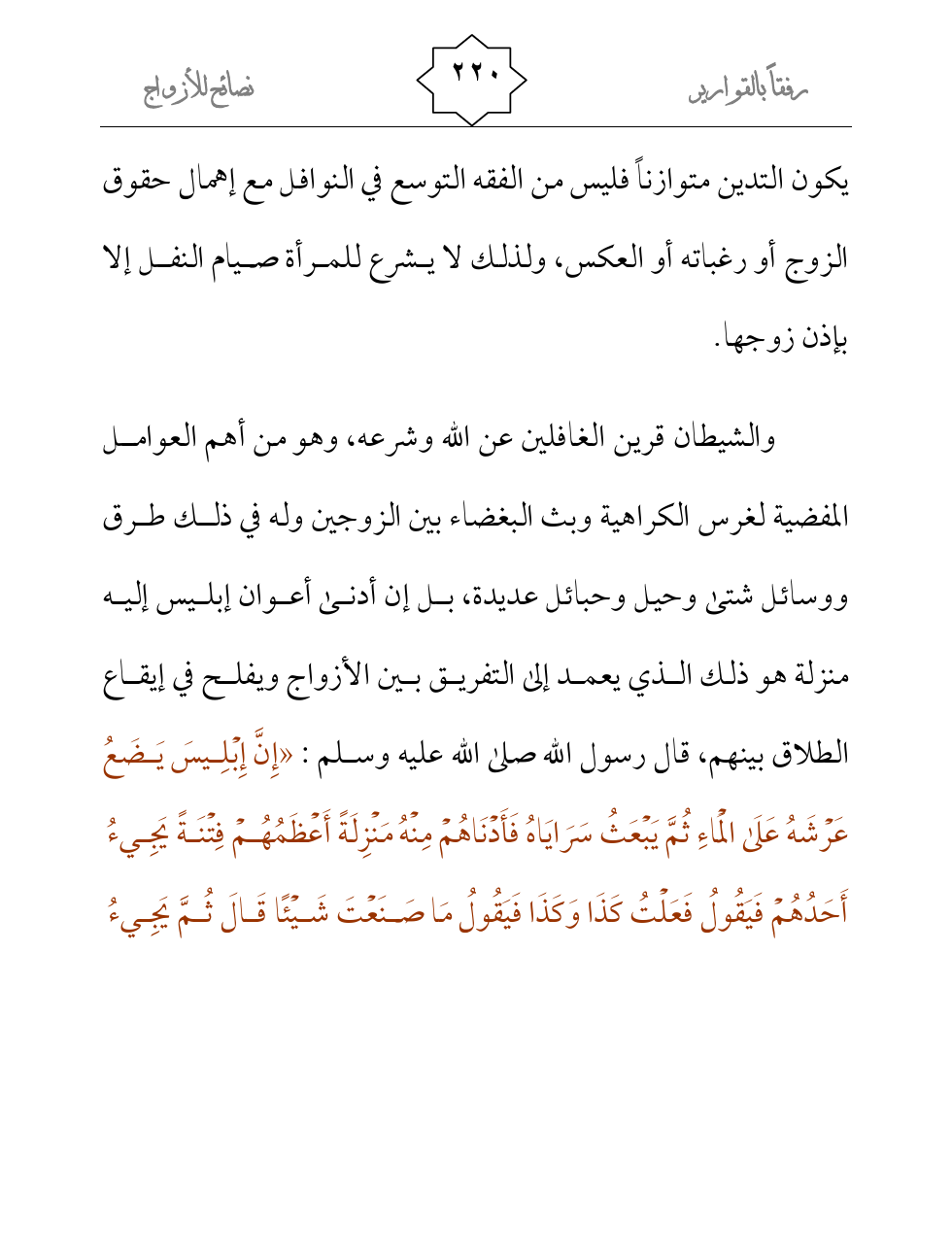 يكون التدين متوازناً فليس من الفقه التوسع في النوافل مع إهمال حقوق الزوج أو رغباته أو العكس، ولذلك لا يشرع للمرأة صيام النفل إلا بإذن زوجها.