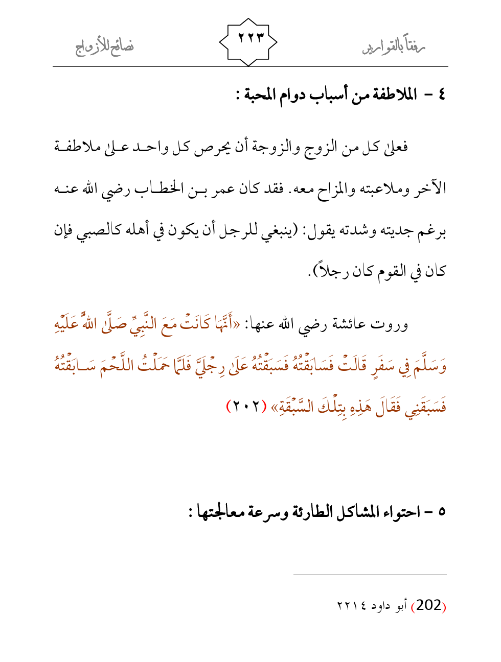 فعلى كل من الزوج والزوجة أن يحرص كل واحد على ملاطفة الآخر وملاعبته والمزاح معه. فقد كان عمر بن الخطاب رضي الله عنه برغم جديته وشدته يقول: (ينبغي للرجل أن يكون في أهله كالصبي فإن كان في القوم كان رجلاً) .