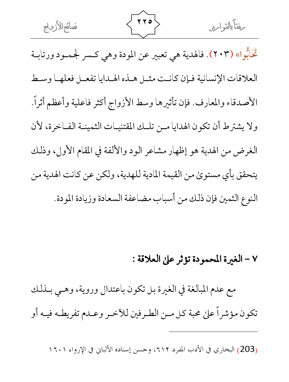 تَحَابُّوا» (¬1) . فالهدية هي تعبير عن المودة وهي كسر لجمود ورتابة العلاقات الإنسانية فإن كانت مثل هذه الهدايا تفعل فعلها وسط الأصدقاء والمعارف. فإن تأثيرها وسط الأزواج أكثر فاعلية وأعظم أثراً. ولا يشترط أن تكون الهدايا من تلك المقتنيات الثمينة الفاخرة، لأن الغرض من الهدية هو إظهار مشاعر الود والألفة في المقام الأول، وذلك يتحقق بأي مستوى من القيمة المادية للهدية، ولكن عن كانت الهدية من النوع الثمين فإن ذلك من أسباب مضاعفة السعادة وزيادة المودة.