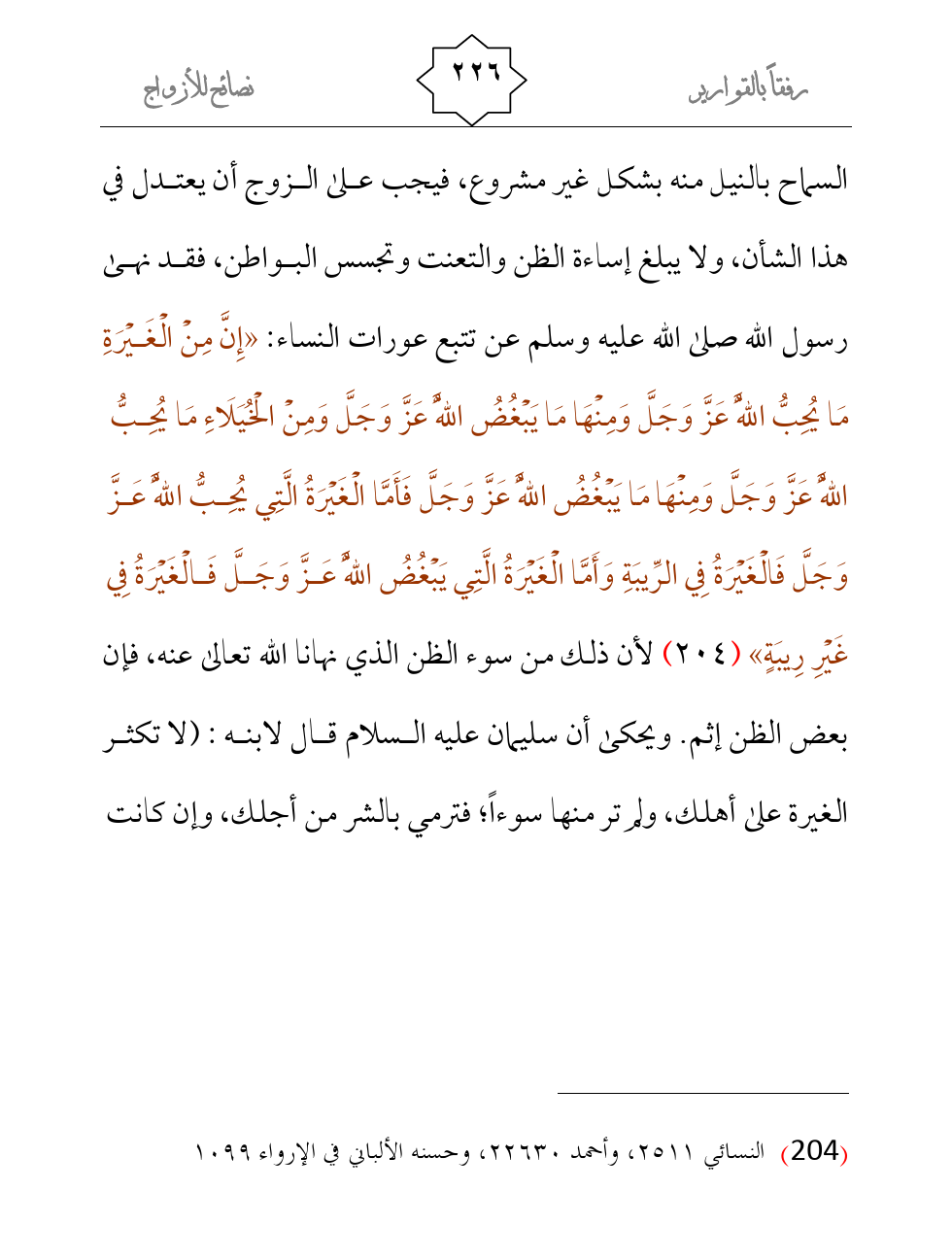 السماح بالنيل منه بشكل غير مشروع، فيجب على الزوج أن يعتدل في هذا الشأن، ولا يبلغ إساءة الظن والتعنت وتجسس البواطن، فقد نهى رسول الله صلى الله عليه وسلم عن تتبع عورات النساء: «إِنَّ مِنْ الْغَيْرَةِ مَا يُحِبُّ اللَّهُ عَزَّ وَجَلَّ وَمِنْهَا مَا يَبْغُضُ اللَّهُ عَزَّ وَجَلَّ وَمِنْ الْخُيَلَاءِ مَا يُحِبُّ اللَّهُ عَزَّ وَجَلَّ وَمِنْهَا مَا يَبْغُضُ اللَّهُ عَزَّ وَجَلَّ فَأَمَّا الْغَيْرَةُ الَّتِي يُحِبُّ اللَّهُ عَزَّ وَجَلَّ فَالْغَيْرَةُ فِي الرِّيبَةِ وَأَمَّا الْغَيْرَةُ الَّتِي يَبْغُضُ اللَّهُ عَزَّ وَجَلَّ فَالْغَيْرَةُ فِي غَيْرِ رِيبَةٍ» (¬1) لأن ذلك من سوء الظن الذي نهانا الله تعالى عنه، فإن بعض الظن إثم. ويحكى أن سليمان عليه السلام قال لابنه: (لا تكثر الغيرة على أهلك، ولم تر منها سوءاً؛ فترمي بالشر من أجلك، وإن كانت