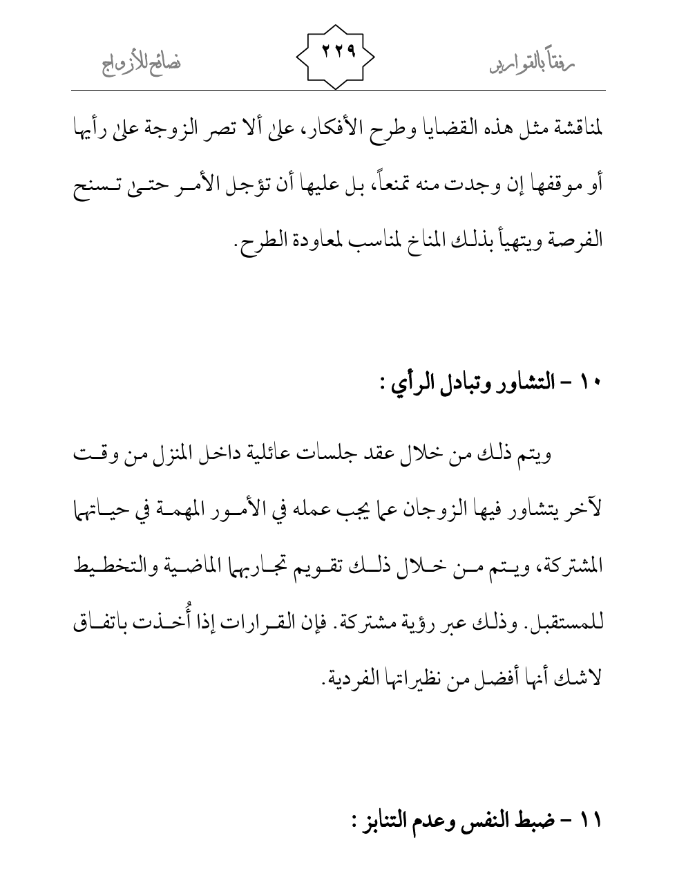 لمناقشة مثل هذه القضايا وطرح الأفكار، على ألا تصر الزوجة على رأيها أو موقفها إن وجدت منه تمنعاً، بل عليها أن تؤجل الأمر حتى تسنح الفرصة ويتهيأ بذلك المناخ لمناسب لمعاودة الطرح.