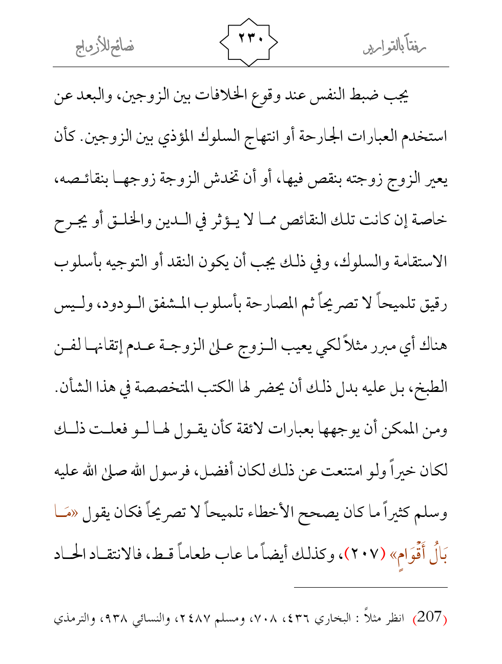 يجب ضبط النفس عند وقوع الخلافات بين الزوجين، والبعد عن استخدم العبارات الجارحة أو انتهاج السلوك المؤذي بين الزوجين. كأن يعير الزوج زوجته بنقص فيها، أو أن تخدش الزوجة زوجها بنقائصه، خاصة إن كانت تلك النقائص مما لا يؤثر في الدين والخلق أو يجرح الاستقامة والسلوك، وفي ذلك يجب أن يكون النقد أو التوجيه بأسلوب رقيق تلميحاً لا تصريحاً ثم المصارحة بأسلوب المشفق الودود، وليس هناك أي مبرر مثلاً لكي يعيب الزوج على الزوجة عدم إتقانها لفن الطبخ، بل عليه بدل ذلك أن يحضر لها الكتب المتخصصة في هذا الشأن. ومن الممكن أن يوجهها بعبارات لائقة كأن يقول لها لو فعلت ذلك لكان خيراً ولو امتنعت عن ذلك لكان أفضل، فرسول الله صلى الله عليه وسلم كثيراً ما كان يصحح الأخطاء تلميحاً لا تصريحاً فكان يقول «مَا بَالُ أَقْوَامٍ» (¬1) ، وكذلك أيضاً ما عاب طعاماً قط، فالانتقاد الحاد