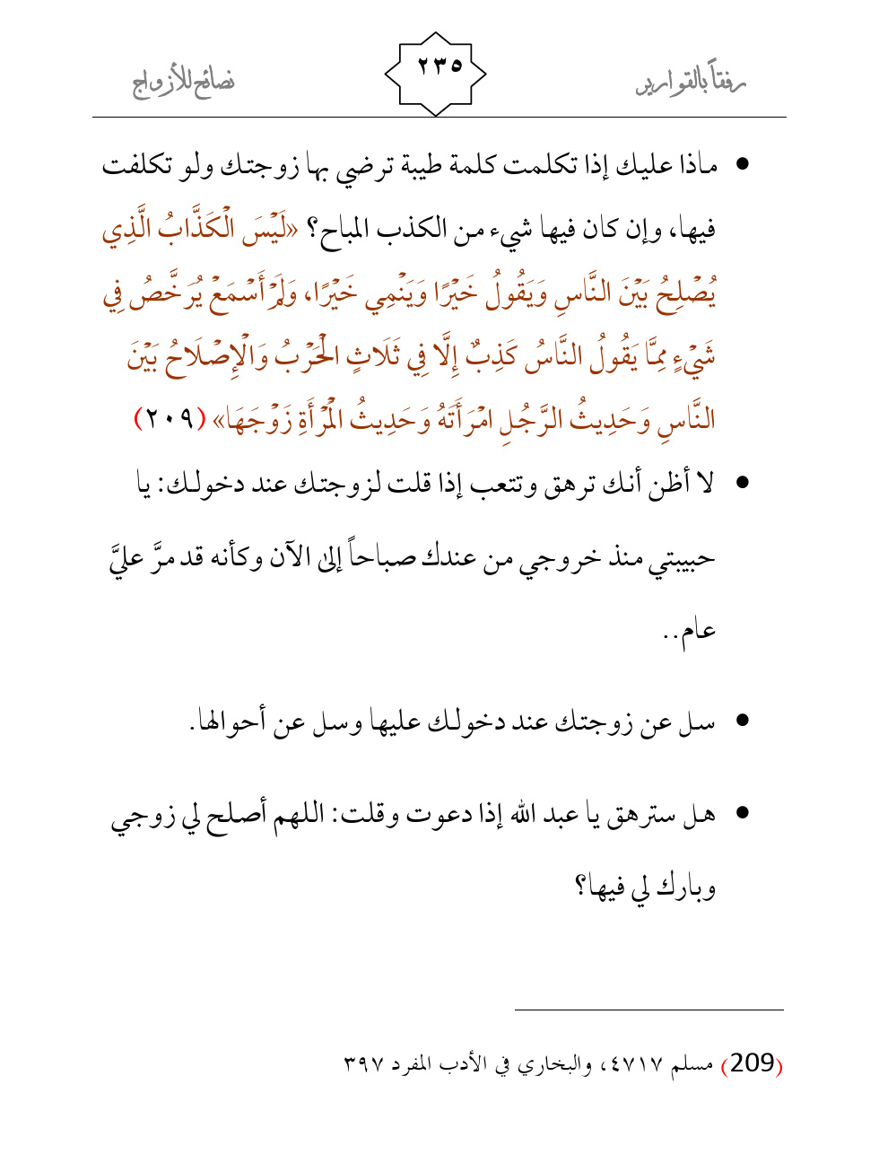 ماذا عليك إذا تكلمت كلمة طيبة ترضي بها زوجتك ولو تكلفت فيها، وإن كان فيها شيء من الكذب المباح؟ «لَيْسَ الْكَذَّابُ الَّذِي يُصْلِحُ بَيْنَ النَّاسِ وَيَقُولُ خَيْرًا وَيَنْمِي خَيْرًا، وَلَمْ أَسْمَعْ يُرَخَّصُ فِي شَيْءٍ مِمَّا يَقُولُ النَّاسُ كَذِبٌ إِلَّا فِي ثَلَاثٍ الْحَرْبُ وَالْإِصْلَاحُ بَيْنَ النَّاسِ وَحَدِيثُ الرَّجُلِ امْرَأَتَهُ وَحَدِيثُ الْمَرْأَةِ زَوْجَهَا» (¬1)