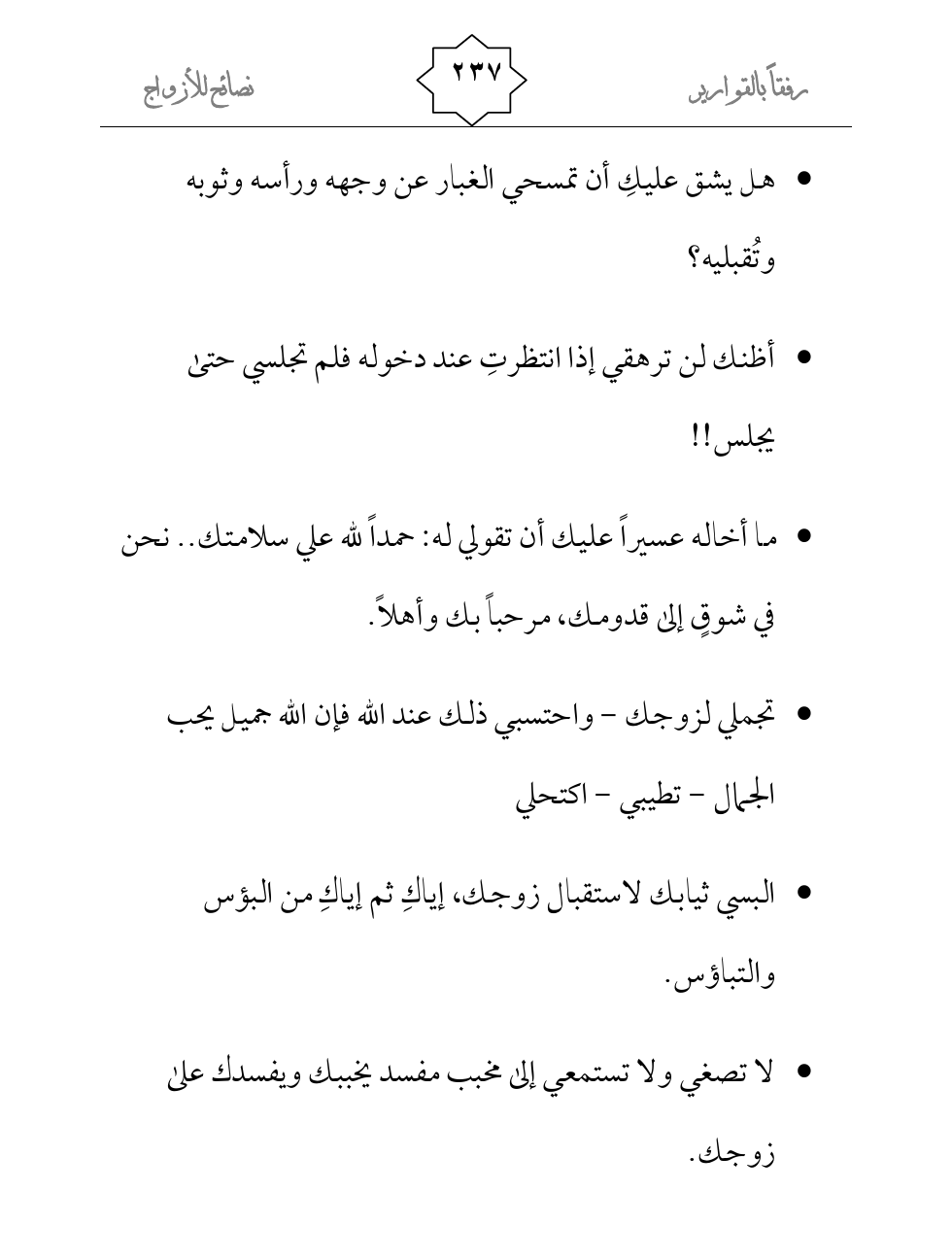 - البسي ثيابك لاستقبال زوجك، إياكِ ثم إياكِ من البؤس والتباؤس.