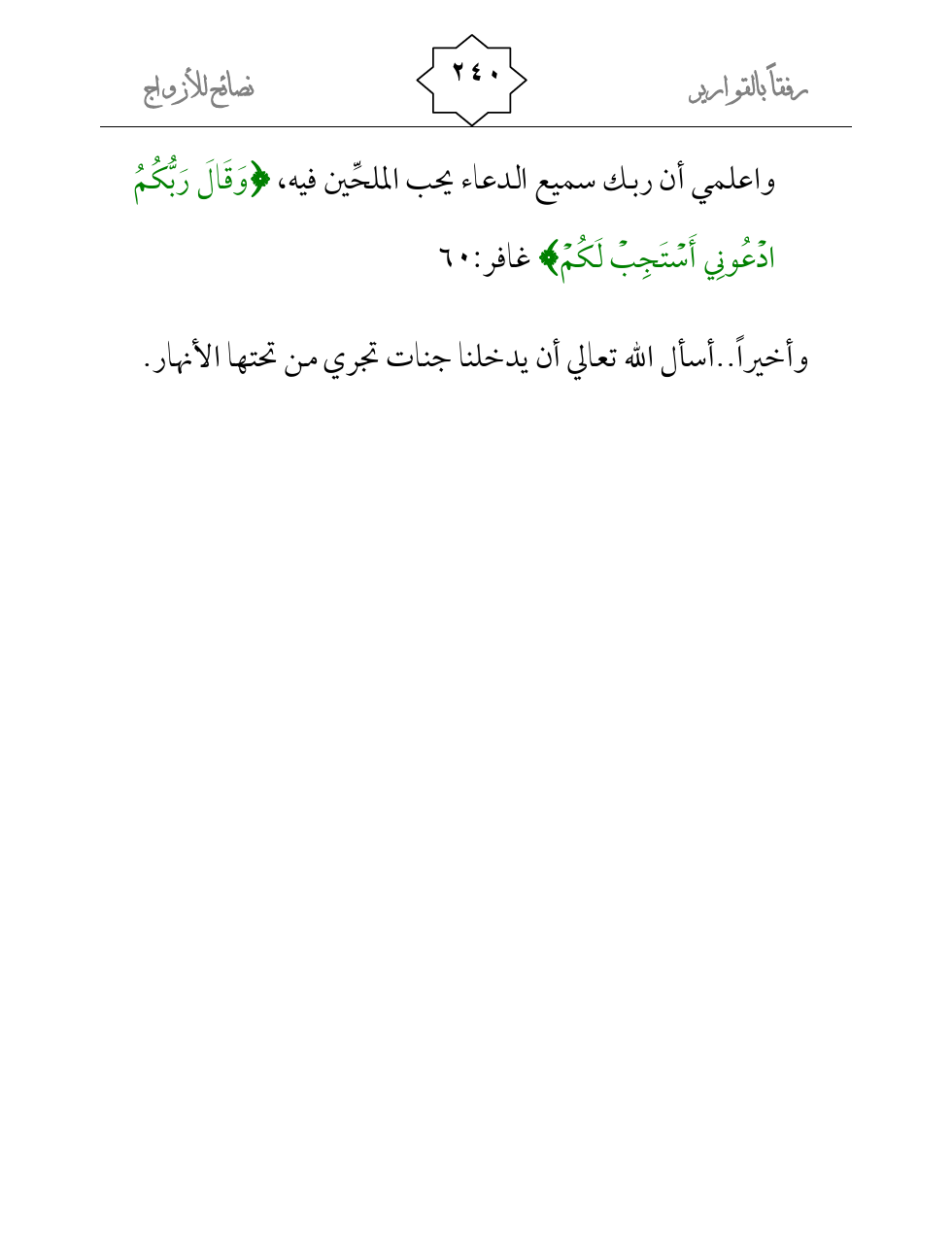 واعلمي أن ربك سميع الدعاء يحب الملحِّين فيه، {وَقَالَ رَبُّكُمُ ادْعُونِي أَسْتَجِبْ لَكُمْ} غافر:60