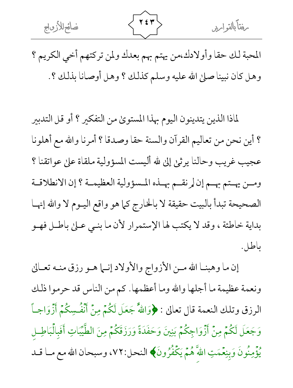 لماذا الذين يتدينون اليوم بهذا المستوى من التفكير؟ أو قل التدبير؟ أين نحن من تعاليم القرآن والسنة حقا وصدقا؟ أمرنا والله مع أهلونا عجيب غريب وحالنا يرثى إلى لله أليست المسؤولية ملقاة على عواتقنا؟ ومن يهتم بهم إن لم نقم بهذه المسؤولية العظيمة؟ إن الانطلاقة الصحيحة تبدأ بالبيت حقيقة لا بالخارج كما هو واقع اليوم لا والله إنها بداية خاطئة، وقد لا يكتب لها الإستمرار لأن ما بني على باطل فهو باطل.