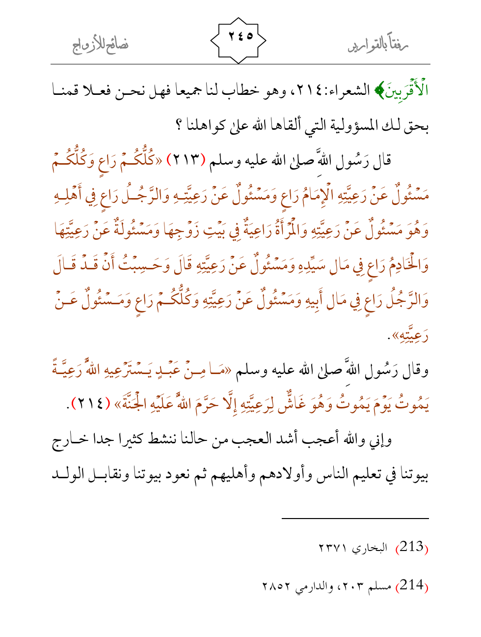 الْأَقْرَبِينَ} الشعراء:214، وهو خطاب لنا جميعا فهل نحن فعلا قمنا بحق لك المسؤولية التي ألقاها الله على كواهلنا؟