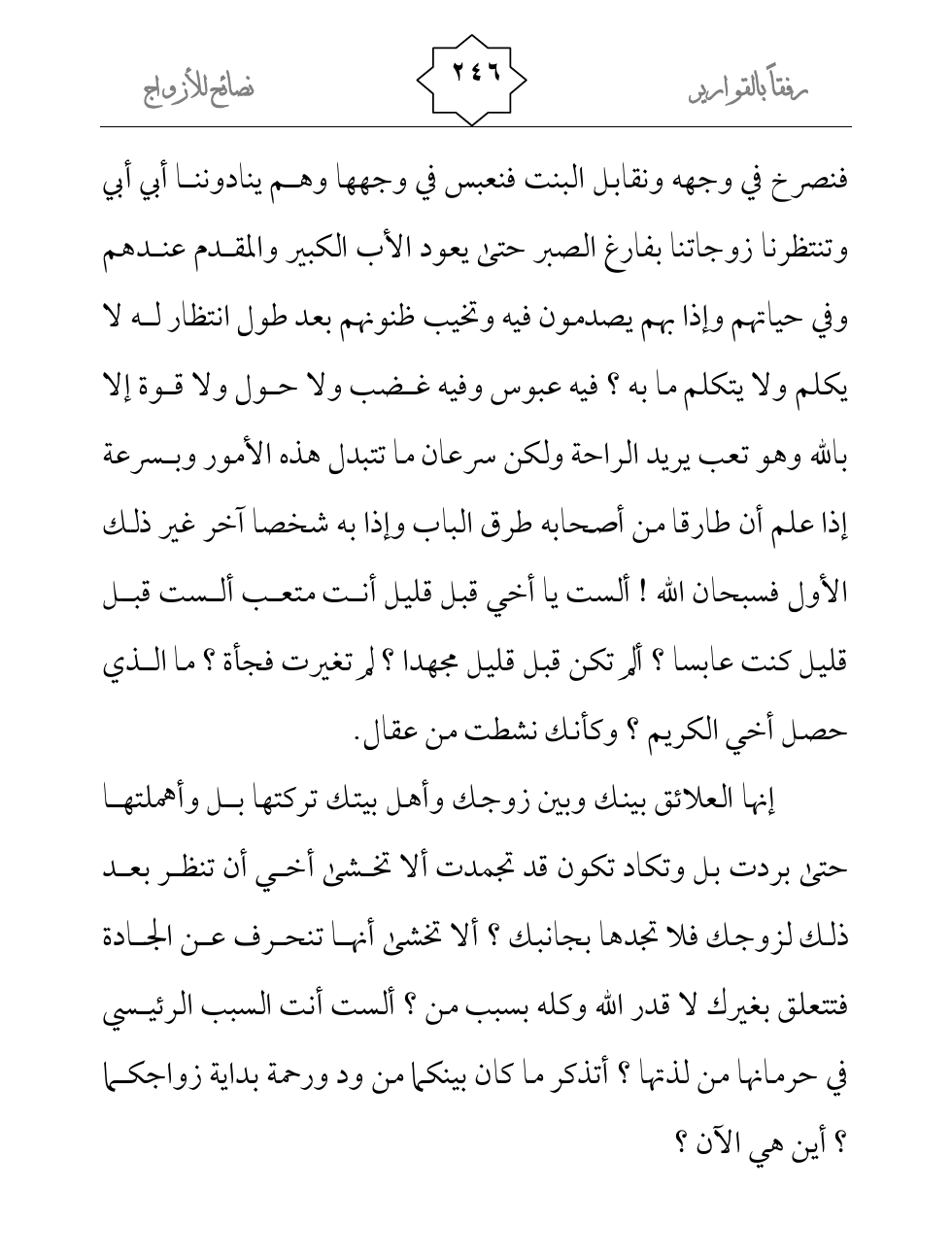 إنها العلائق بينك وبين زوجك وأهل بيتك تركتها بل وأهملتها حتى بردت بل وتكاد تكون قد تجمدت ألا تخشى أخي أن تنظر بعد ذلك لزوجك فلا تجدها بجانبك؟ ألا تخشى أنها تنحرف عن الجادة فتتعلق بغيرك لا قدر الله وكله بسبب من؟ ألست أنت السبب الرئيسي في حرمانها من لذتها؟ أتذكر ما كان بينكما من ود ورحمة بداية زواجكما؟ أين هي الآن؟