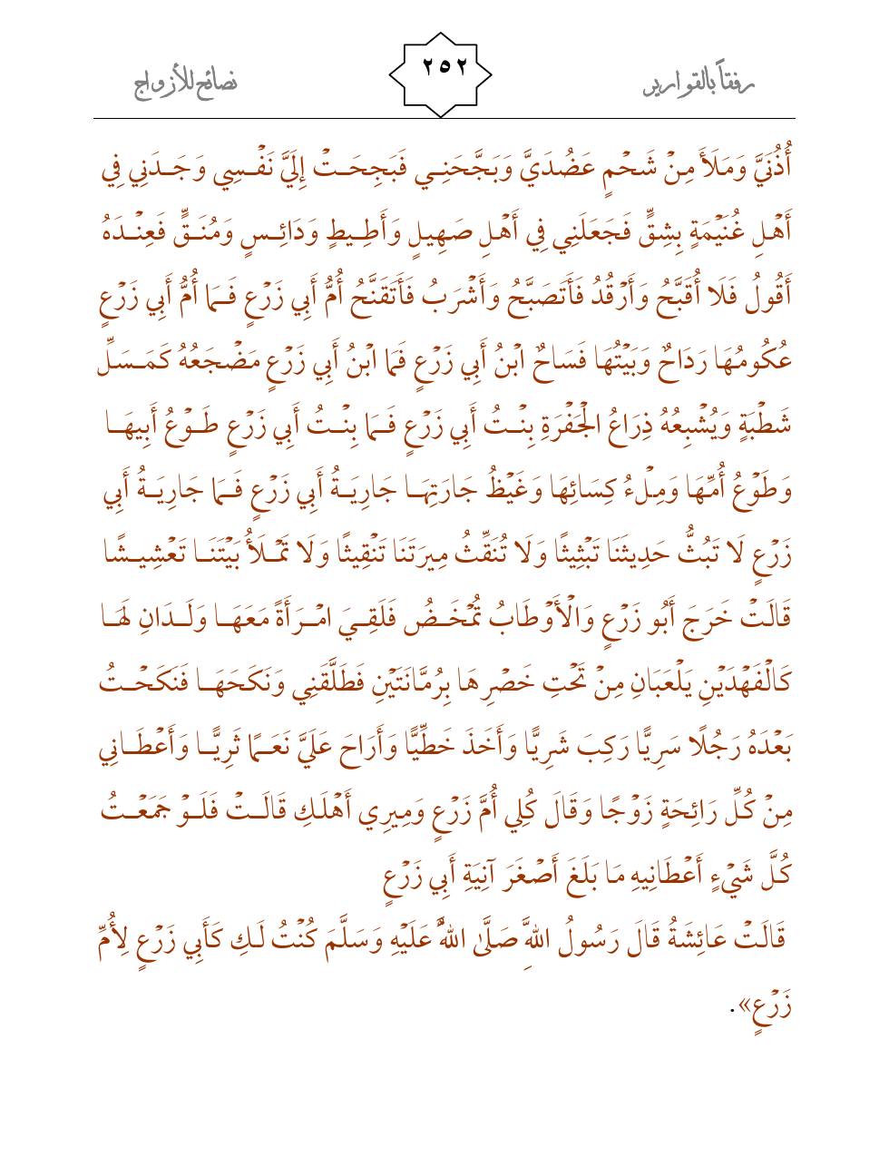 أُذُنَيَّ وَمَلَأَ مِنْ شَحْمٍ عَضُدَيَّ وَبَجَّحَنِي فَبَجِحَتْ إِلَيَّ نَفْسِي وَجَدَنِي فِي أَهْلِ غُنَيْمَةٍ بِشِقٍّ فَجَعَلَنِي فِي أَهْلِ صَهِيلٍ وَأَطِيطٍ وَدَائِسٍ وَمُنَقٍّ فَعِنْدَهُ أَقُولُ فَلَا أُقَبَّحُ وَأَرْقُدُ فَأَتَصَبَّحُ وَأَشْرَبُ فَأَتَقَنَّحُ أُمُّ أَبِي زَرْعٍ فَمَا أُمُّ أَبِي زَرْعٍ عُكُومُهَا رَدَاحٌ وَبَيْتُهَا فَسَاحٌ ابْنُ أَبِي زَرْعٍ فَمَا ابْنُ أَبِي زَرْعٍ مَضْجَعُهُ كَمَسَلِّ شَطْبَةٍ وَيُشْبِعُهُ ذِرَاعُ الْجَفْرَةِ بِنْتُ أَبِي زَرْعٍ فَمَا بِنْتُ أَبِي زَرْعٍ طَوْعُ أَبِيهَا وَطَوْعُ أُمِّهَا وَمِلْءُ كِسَائِهَا وَغَيْظُ جَارَتِهَا جَارِيَةُ أَبِي زَرْعٍ فَمَا جَارِيَةُ أَبِي زَرْعٍ لَا تَبُثُّ حَدِيثَنَا تَبْثِيثًا وَلَا تُنَقِّثُ مِيرَتَنَا تَنْقِيثًا وَلَا تَمْلَأُ بَيْتَنَا تَعْشِيشًا قَالَتْ خَرَجَ أَبُو زَرْعٍ وَالْأَوْطَابُ تُمْخَضُ فَلَقِيَ امْرَأَةً مَعَهَا وَلَدَانِ لَهَا كَالْفَهْدَيْنِ يَلْعَبَانِ مِنْ تَحْتِ خَصْرِهَا بِرُمَّانَتَيْنِ فَطَلَّقَنِي وَنَكَحَهَا فَنَكَحْتُ بَعْدَهُ رَجُلًا سَرِيًّا رَكِبَ شَرِيًّا وَأَخَذَ خَطِّيًّا وَأَرَاحَ عَلَيَّ نَعَمًا ثَرِيًّا وَأَعْطَانِي مِنْ كُلِّ رَائِحَةٍ زَوْجًا وَقَالَ كُلِي أُمَّ زَرْعٍ وَمِيرِي أَهْلَكِ قَالَتْ فَلَوْ جَمَعْتُ كُلَّ شَيْءٍ أَعْطَانِيهِ مَا بَلَغَ أَصْغَرَ آنِيَةِ أَبِي زَرْعٍ