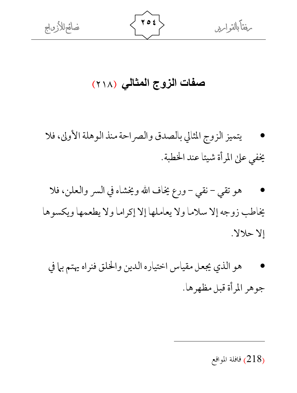 - هو الذي يجعل مقياس اختياره الدين والخلق فنراه يهتم بما في جوهر المرأة قبل مظهرها.