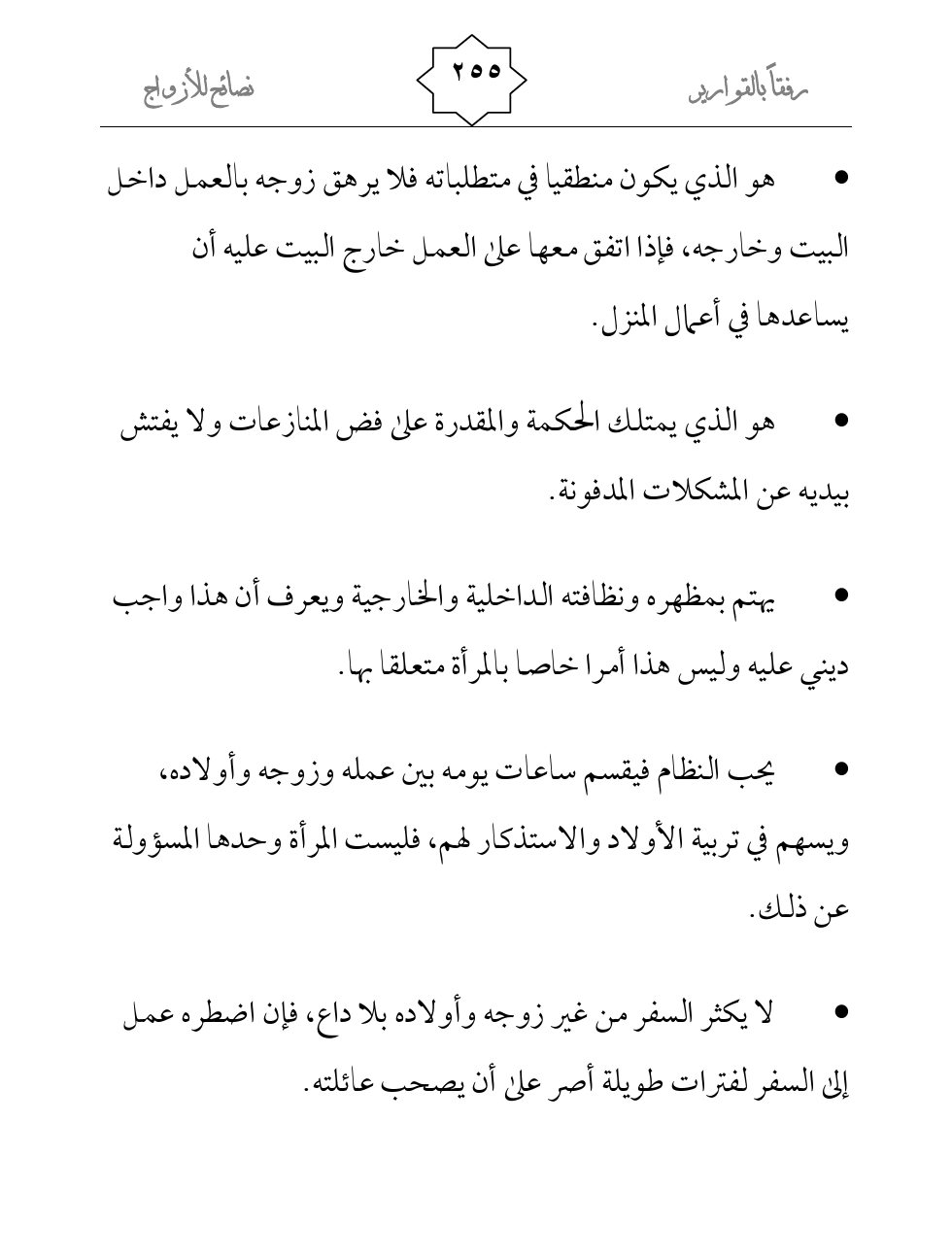 - هو الذي يكون منطقيا في متطلباته فلا يرهق زوجه بالعمل داخل البيت وخارجه، فإذا اتفق معها على العمل خارج البيت عليه أن يساعدها في أعمال المنزل.